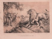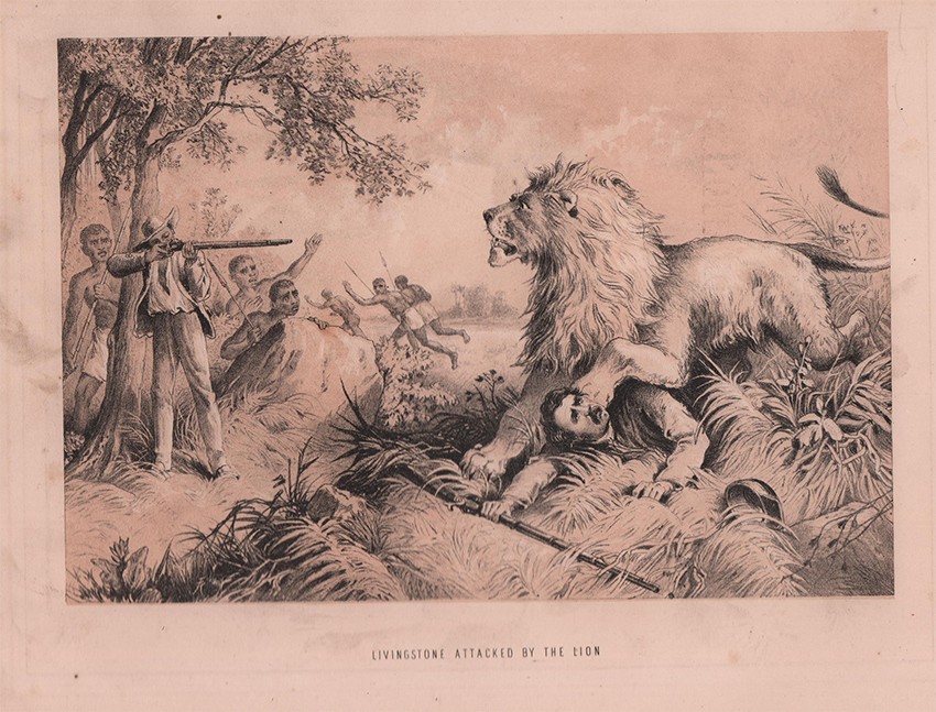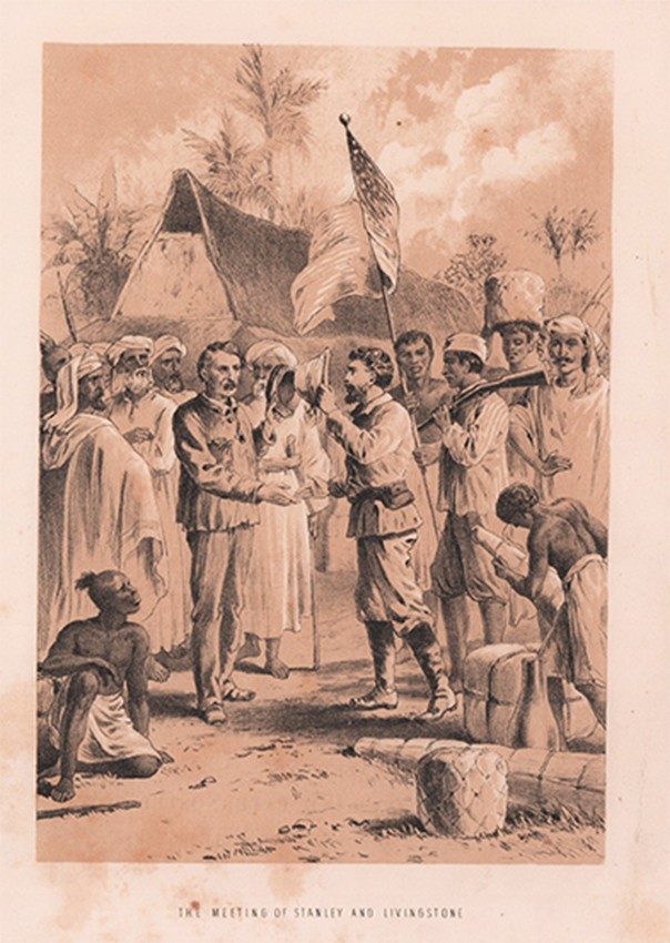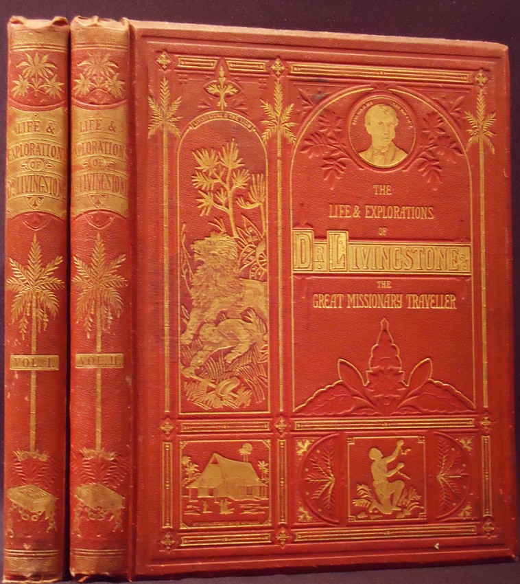 2 volumes, [321] - 632 pages – continuous pagination, additional lithographic title page, lithographic frontispiece in Volume 1 - Livingstone attacked by the lion, frontispiece in Volume 2 – The meeting of Stanley and Livingstone, numerous tinted lithographic plates, decorative red cloth gilt with bevelled boards, blind stamped on the back covers, spines gilt, edges gilt, contents of volume 1 detached from the covers, preliminary pages are loose, volume 2 starting to wear at the front hinge, but holding on to the netting.