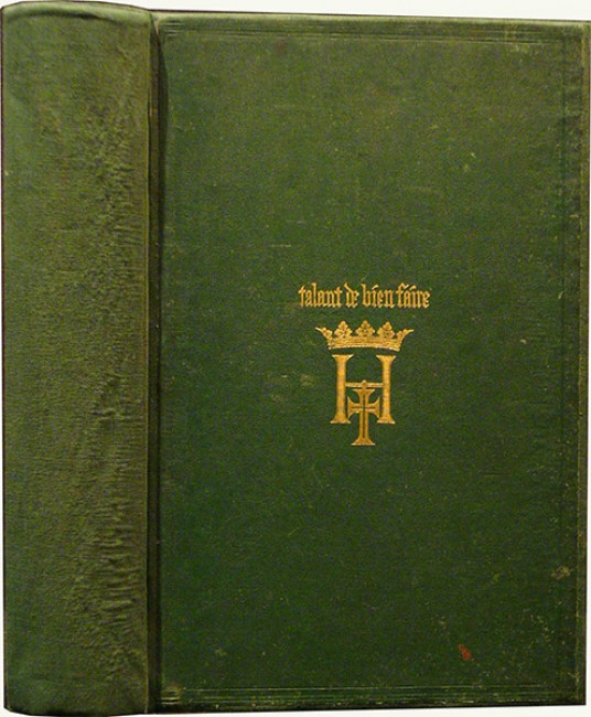 487 pages, colour frontispiece portrait heightened with gold, 2 maps ‘shewing (sic) Authenticated Discovery of Australia by the Portuguese in 1601,’ coast lines hand coloured in blue, large folding ‘Skeleton Chart of Africa to Illustrate the Voyages of the Portuguese in the Fifteenth Century,’ coast line hand coloured in blue (map is torn at the first fold), other illustrations in the text, rebound in green cloth with the original upper and lower covers laid down – spine without titling, contents good.