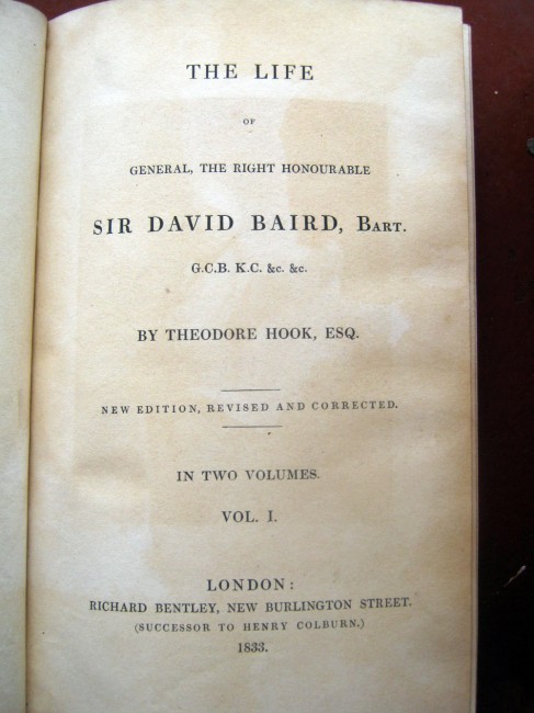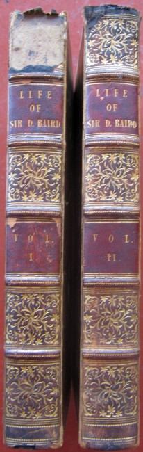 Two volume set, full leather with gilt lettering, raised bands and marbled endpapers. Previous owner\'s name on prelims. Ex-libris plate of Sir John Hall of Dunglass, Baronet of Edinburgh on front paste-down endpaper. New edition, revised and corrected. Vol 1 has top of spine missing the corner of Vol 2\'s spine has a small piece missing. Some rubbing to boards and foxing throughout. pp. xii, 416, portrait, plate of Seringapatam,folding map. viii, 418, folding sketch map. Baird, an English army officer, served in India and Egypt.