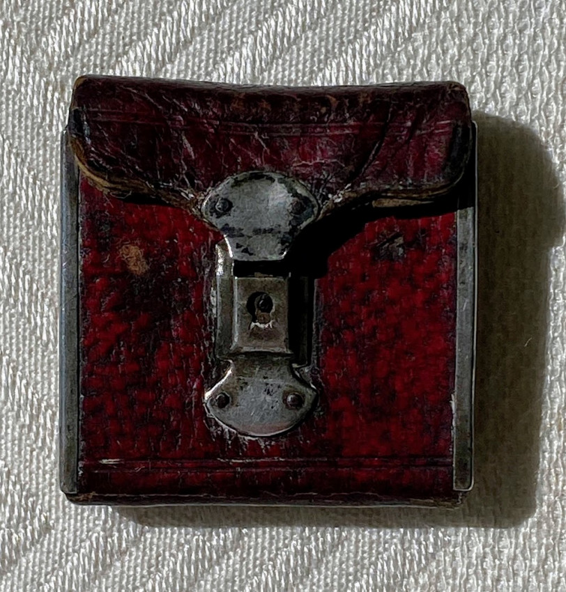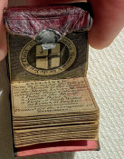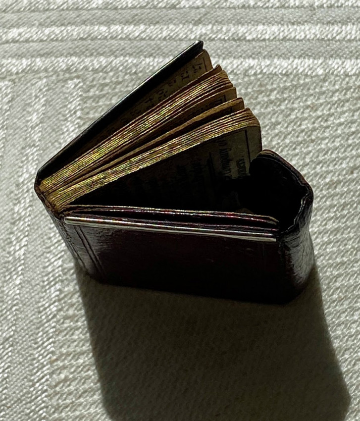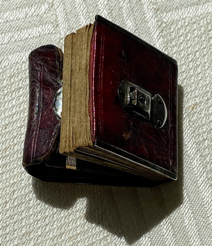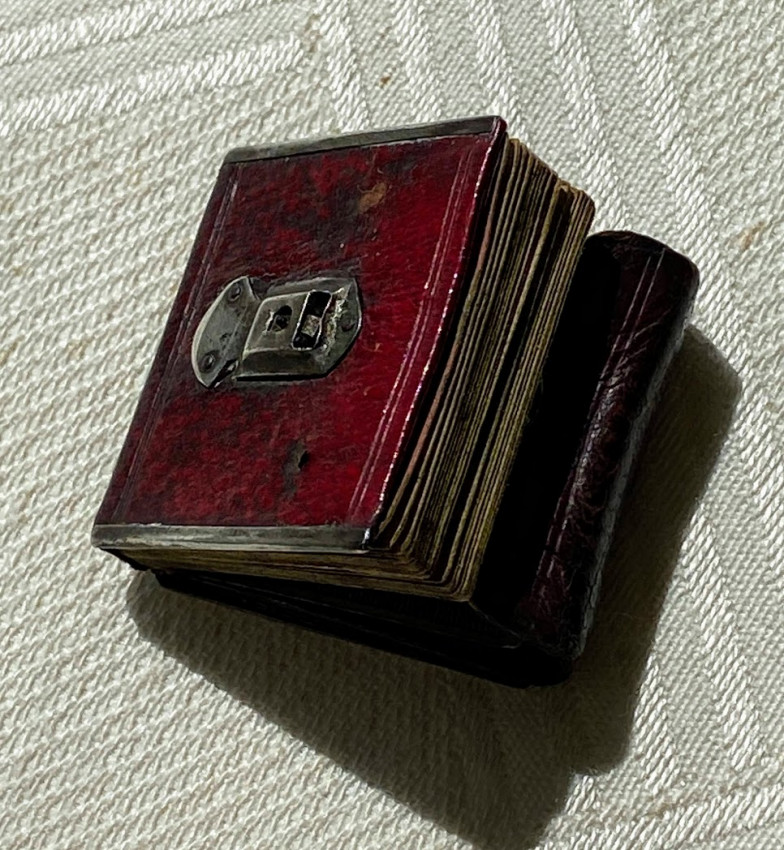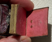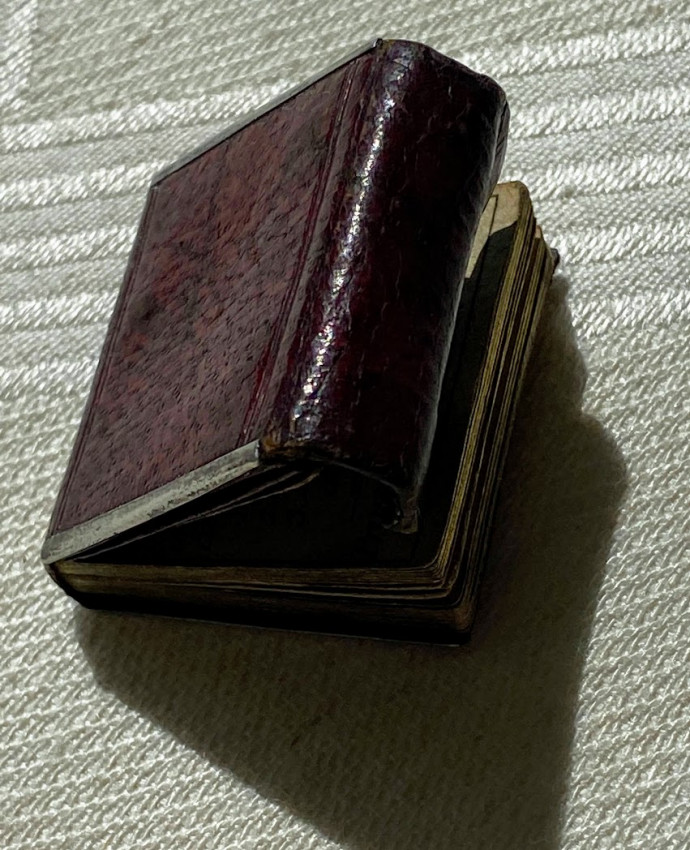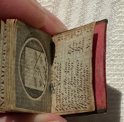 MINIATURE BOOK. – The London Almanack for the year of Christ 1791. [London:] printed for the Company of Stationers, [1790]. 1 1/8 x 1 1/8in; 28 x 28mm. Engraved throughout, red duty stamp to title, 2pp. title + 38 pages of text. Contemporary wallet-style red morocco binding, flap and upper cover with white-metal face catch, four edges with white-metal edging, rose-colored paper endpapers, pocket at the front (some light discoloration).
