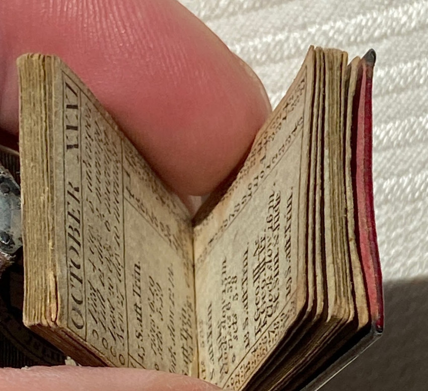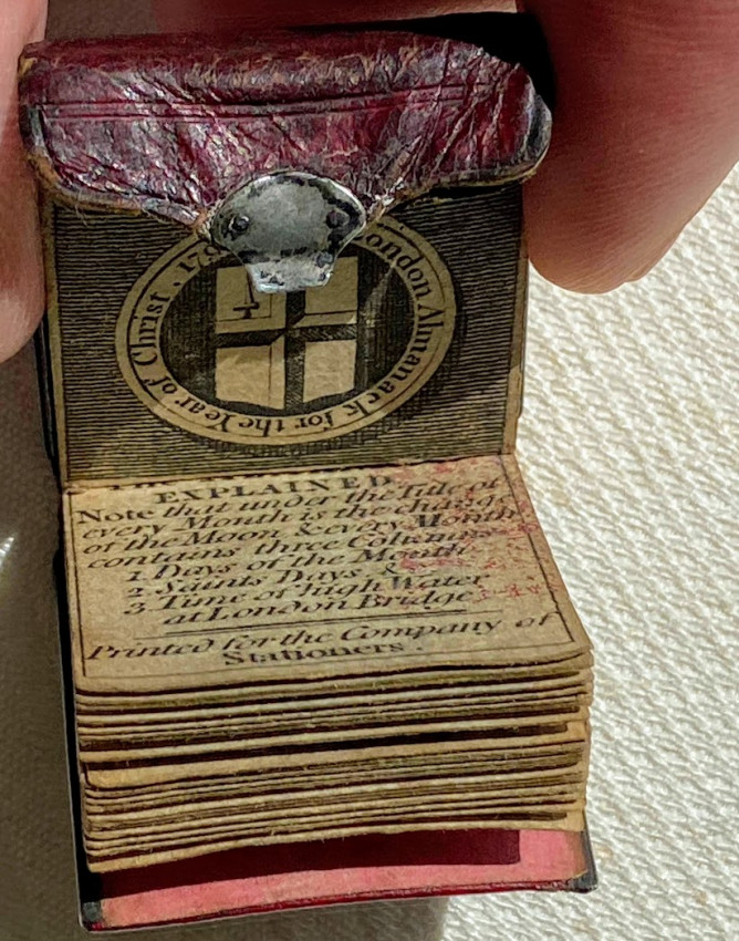 “The format of the almanack was almost always the same: a title page showing the arms of the City of London ringed with the title and date, and an explanation of the contents (which also shows a red tax stamp until 1834); a multi-paged, and sometimes folding, engraved plate of a London landmark (but not in the tiniest-sized almanacks); “Common Notes” listing the dates for such days as Easter Sunday, Whit Sunday, Advent, etc.; one page per month listing moon phases, festival days, quarter days, etc.; a table of Kings and Queens of England; a listing of Lord Mayors and Sheriffs of London; a list of holidays; a page of current coinage or other currency information.” (https://candicehern.com/regencyworld/miniature-almanacks/).