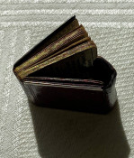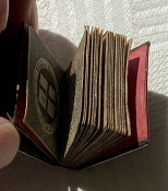 The almanack is contained in a leather wallet which has a pocket at the front.The twelve-month calendar is followed by a table of the reigns of English Kings and Queens reigns, Lord Mayors and Sheriffs from the year 1767 to the year 1791, a list of holidays and of the current coinage. This small format is as issued, and is bound without the folding view found in the larger portrait format copies.