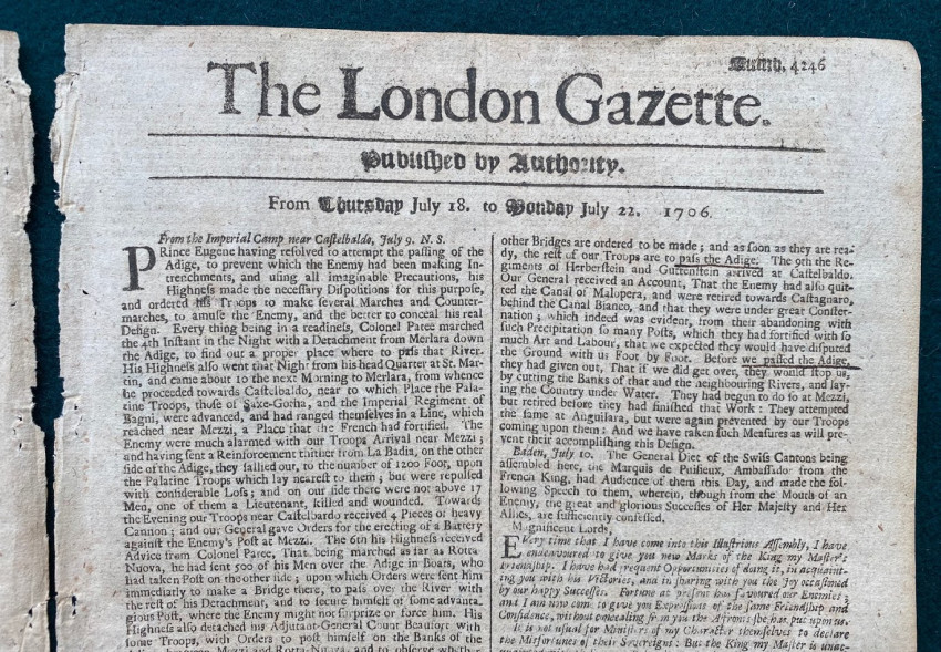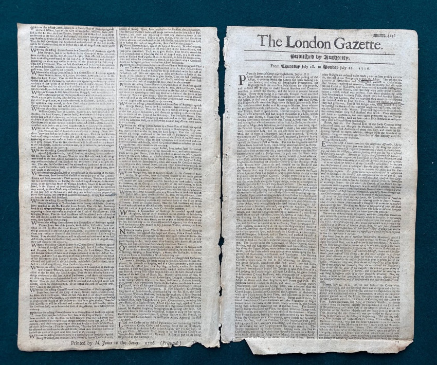 'The London Gazette', number 4246, 'From Thursday July 18. to Monday July 22. 1706', small folio (12 ½ x 7 1/2 in; 318 x 190mm), 4pp. Disbound.
