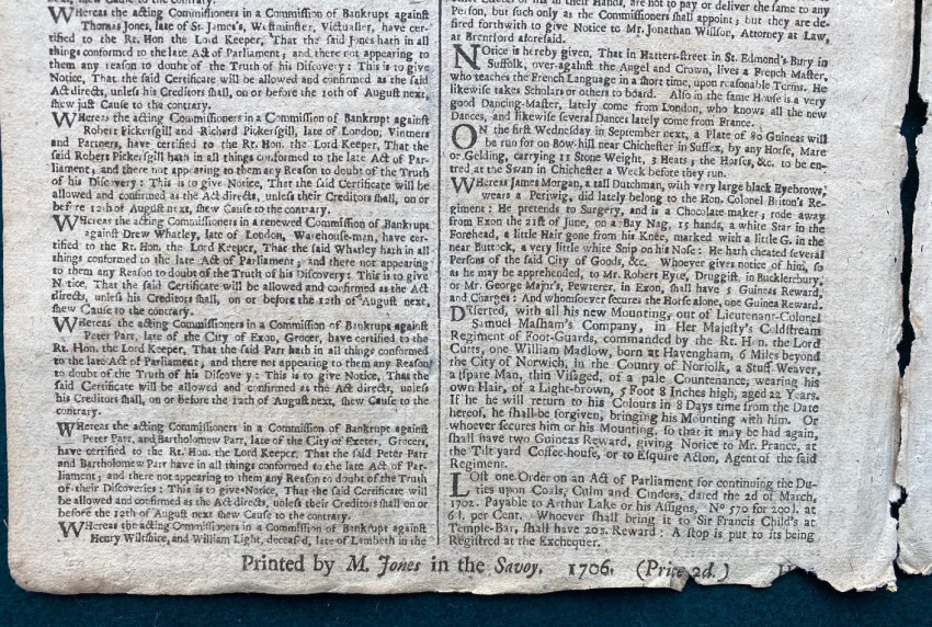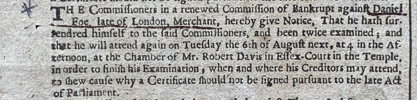 In addition to the news from home and abroad, the advertisements include the following: 'The Commissioners in a renewed Commission of Bankrupt against Daniel Foe [sic.], late of London, Merchant, hereby give Notice, That he hath surrendered himself to the said Commissioners, and been twice examined, and that he will attend again on Tuesday the 6th of August, at 4 in the Afternoon, at the Chamber of Mr. Robert Davis in Essex-Court in the Temple, in order to finish his Examination, when and where his Creditors may attend, to shew [sic.] cause why a Certificate should not be signed pursuant to the late Act of Parliament.'