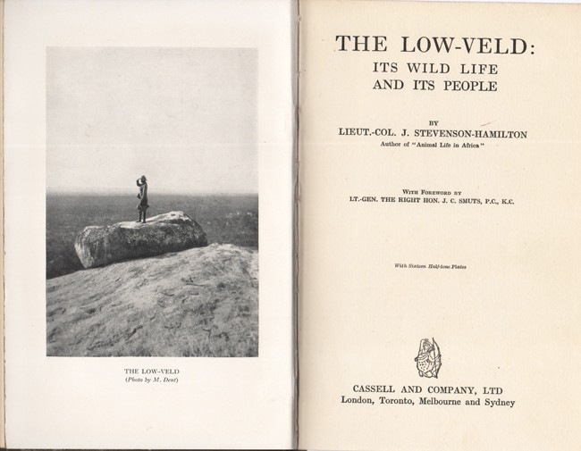 'Colonel Stevenson-Hamilton....has identified himself with that corner of South Africa (the Transvaal Low-Veld) as no other man has done. For twenty-six years now he has been in charge of it, and his efforts on behalf of its fauna have resulted in the statutory establishment of the Kruger National Park, which will ever remain a monumnet to him personally.' Foreword.