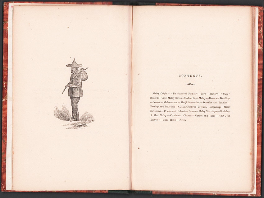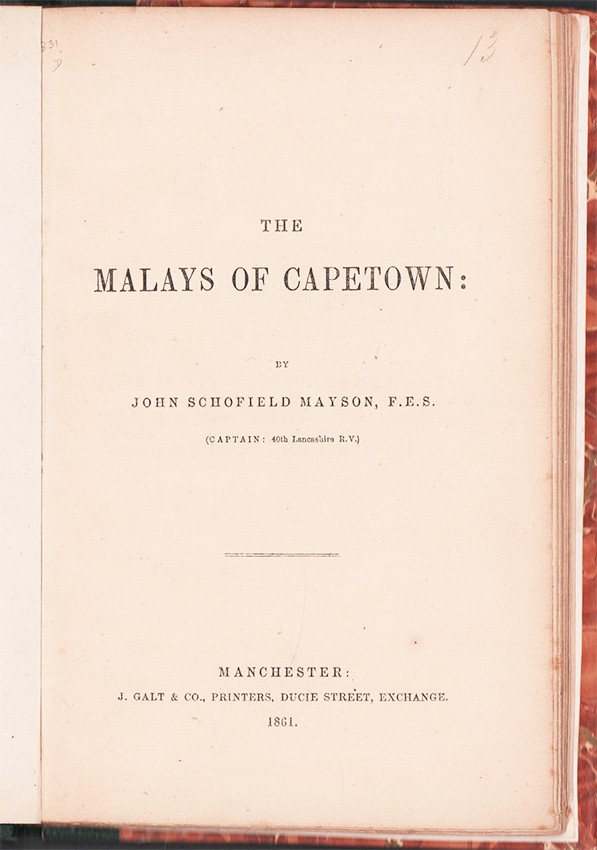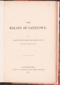 Mendelssohn (Sydney) South African Bibliography, volume 1, page 1003, 'This pamphlet, which has been "reprinted from the 'Transactions of the Manchester Statistical Society,' with additions," gives an account of the origin, religion, habits, occupations, and social position of the Malays at Cape Town.