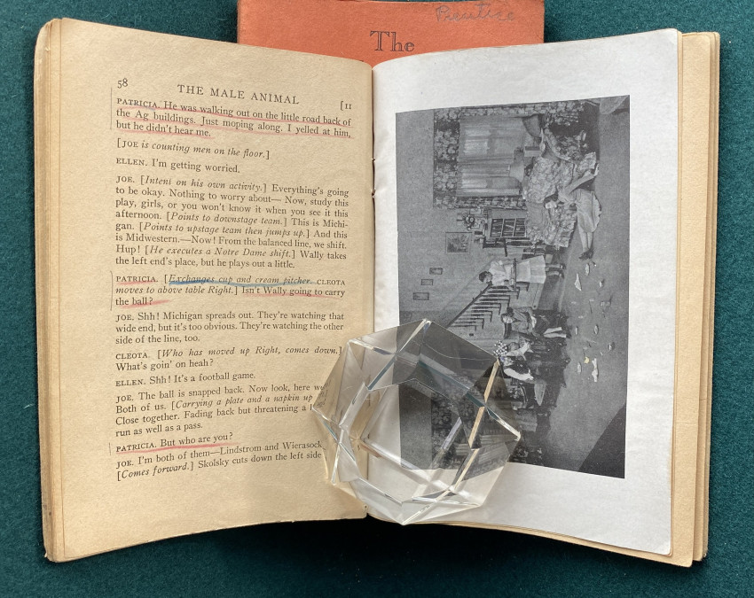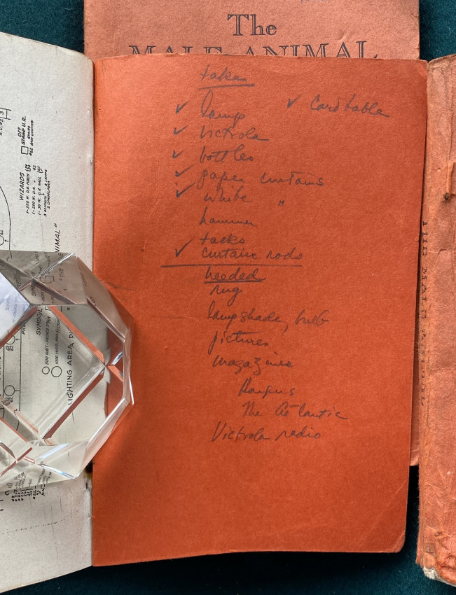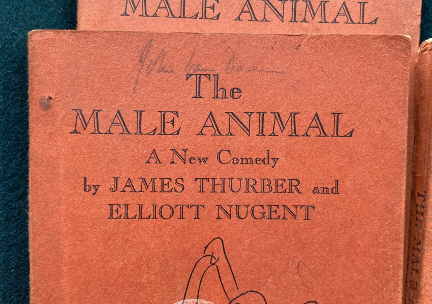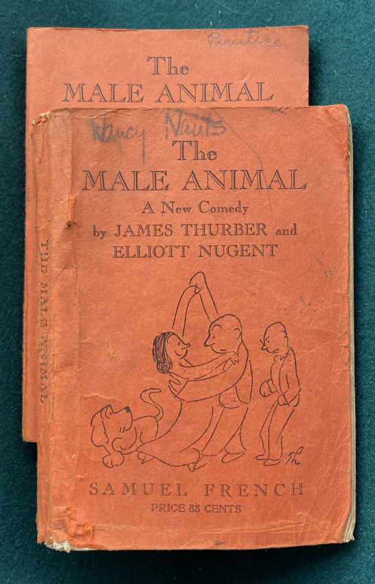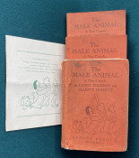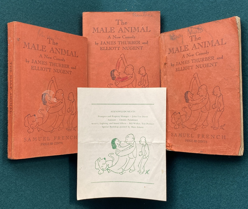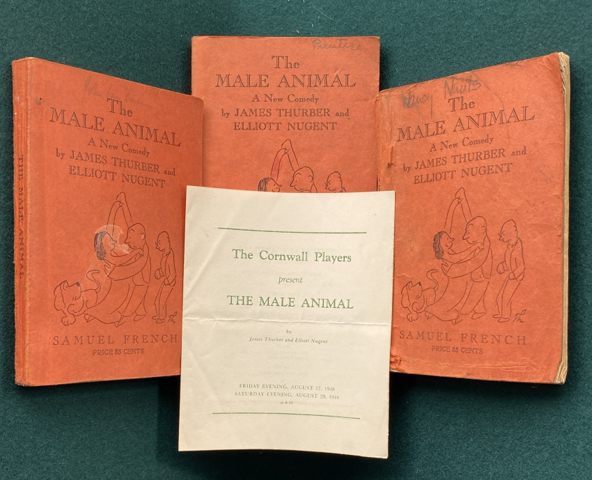 [with:] James THURBER & Elliott NUGENT. [Copy 1] The Male Animal. New York, [etc.] Samuel French, [1941]. Small octavo. 2 plates. Original wrappers, the upper cover with a design after Thurber. Provenance: John van Doren (1928-2019, 'prompter and property manager', signature on upper cover and notes and underlinings, etc. throughout); [Copy 2] The Male Animal. New York, [etc.] Samuel French, [1941]. Small octavo. 2 plates. Original wrappers, the upper cover with a design after Thurber. Provenance: [Tim] Prentice (b. 1930, '"Nutsy" Miller, scenery, lighting, and sound effects', surname on upper cover, underlings and highlighting); [Copy 3] The Male Animal. New York, [etc.] Samuel French, [1941]. Small octavo. 2 plates. Original wrappers, the upper cover with a design after Thurber. (Worn). Provenance: Nancy Coley Nauts ('Patricia Stanley', signature on upper cover, underlinings and and highlighting).