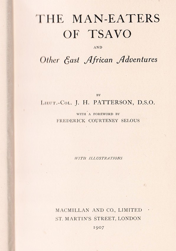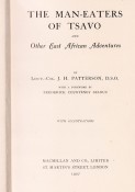 Czech (Kenneth) An Annotated Bibliography of African Big Game Hunting Books 1785 -1999, page 213 -214: One of the most famous of all African hunting titles this describes the slaughter of railroad workers building the Uganda Railway by a pair of man eating lions. The first half of the book relates Patterson's efforts to destroy the man-eaters, while the remaining chapters detail efforts to hunt rhino near Tsavo, then lion and a variety of pains game on the Athi River.