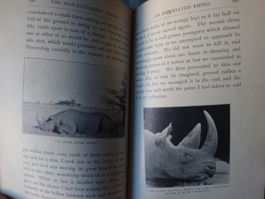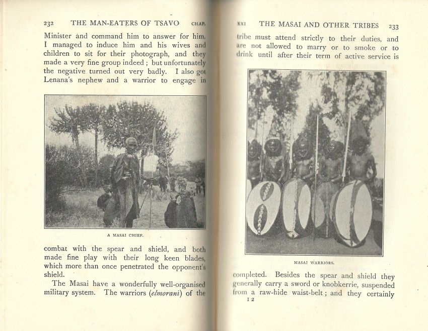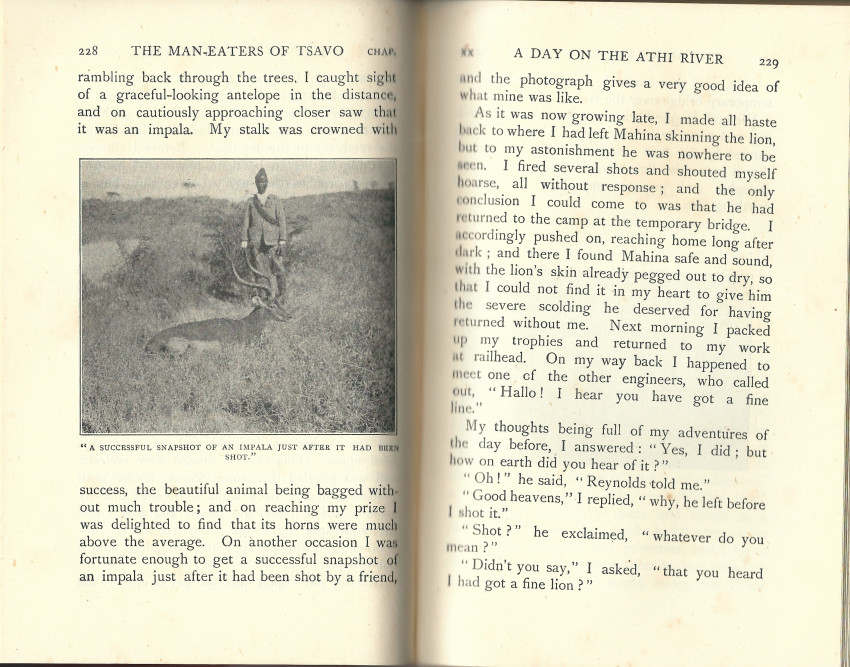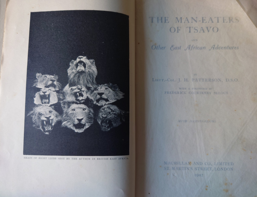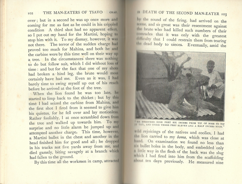 A classic lion hunting adventure in British East Africa. Patterson was appointed by the Foreign Office to supervise the construction of the Uganda Railway, connecting that colony and the Kenyan interior with the coast at Mombasa. The project was held up for some time by lions attacking and killing numerous employees of the company.