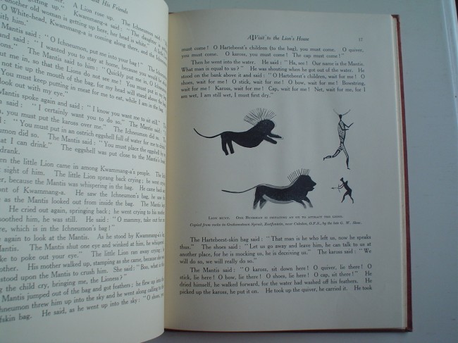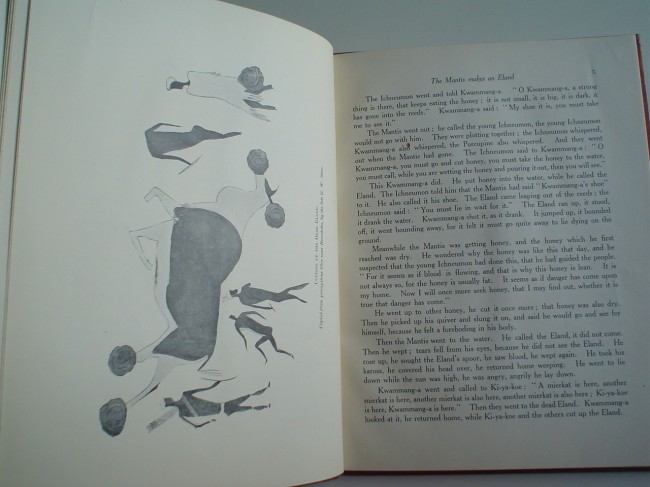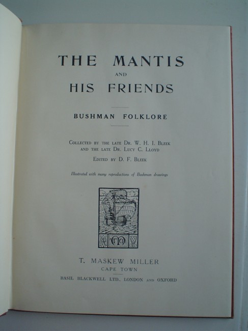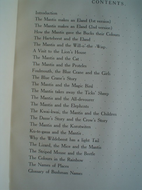 From the introduction by Dorothea Bleek: 'The tales in this volume were all written down in the seventies by my father, the late Dr. Bleek, and my aunt, the late Dr. Lucy Lloyd. They were dictated by Bushmen in their own language, and many of them were translated at once with the help of the narrators. Of the great number of stories collected then, some were published by my aunt in 1910 in 'Specimens of Bushman Folklore', but many are still left. Since her death I have been preparing some of these for publication, and have chosen as a first installment the tales in which the Mantis or members of his family play a part.'
