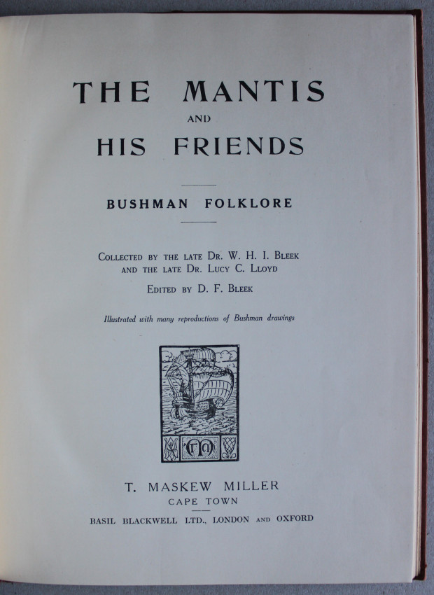 From the introduction by Dorothea Bleek: 'The tales in this volume were all written down in the seventies by my father, the late Dr. Bleek, and my aunt, the late Dr. Lucy Lloyd. They were dictated by Bushmen in their own language, and many of them were translated at once with the help of the narrators. Of the great number of stories collected then, some were published by my aunt in 1910 in 'Specimens of Bushman Folklore', but many are still left. Since her death I have been preparing some of these for publication, and have chosen as a first installment the tales in which the Mantis or members of his family play a part.'