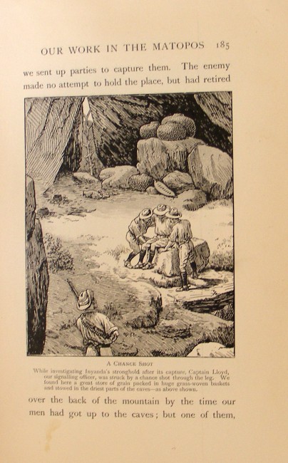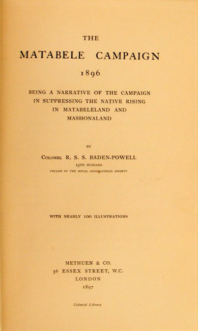 The Matabele Campaign 1896; Being a Narrative of the Campaign in Suppressing the Native Rising in Matabeleland and Mashonaland. Methuen's Colonial Library, 1897, with nearly 100 illustrations, frontispiece of a Matabele Warrior making Disparaging Remarks, 500 pages, sun faded spine has tears at extremities, previous owners names on blank page, 150 x 225mm, condition: good.