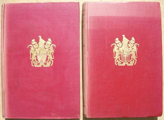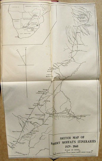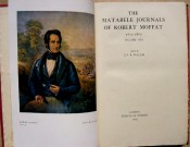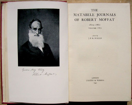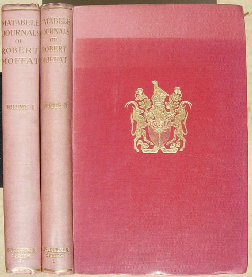 Original red (spines faded) buckram bindings with gilt titling on the spines and a gilt Coat of Arms of Rhodesia decorative motif on the upper boards. Top edges gilt. Volume one has xv prelims, 382 pages, a full colour frontis portrait of Robert Moffat, 2 back and white plates and a large folding map at the rear. Volume two has 10 prelims, 295 pages, 3 black and white plates and a folding map at the rear, which is the same in both volumes.