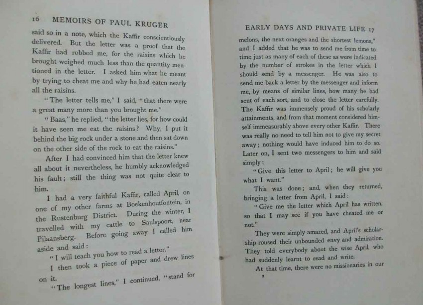 In the "Publisher's Note" it is stated that " Mr Kruger dictated these memoirs to Mr.H.C. Bredell, his private secretary, and to Mr. Piet Grobler the former Under Secretary of State of the South African Republic, and that these gentlemen handed their notes to an editor, the Rev. Dr.A. Schowalter, who spent several weeks at Utrecht in constant colloquy with Mr. Kruger, elucidating various points with the aid of the President's replies."