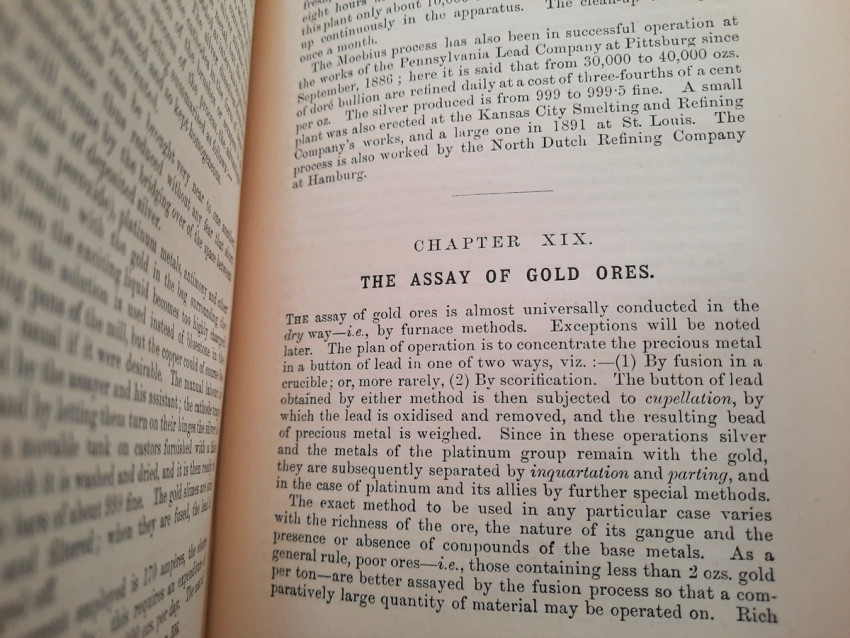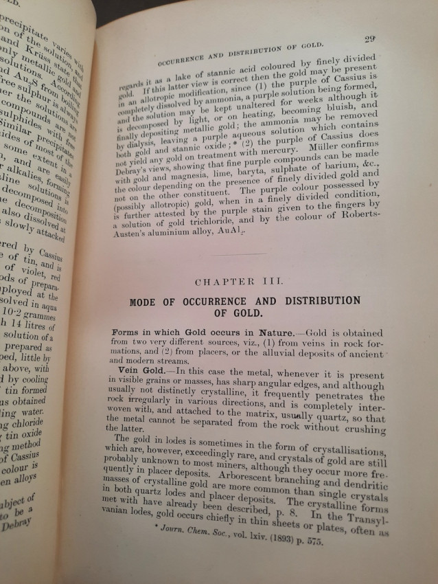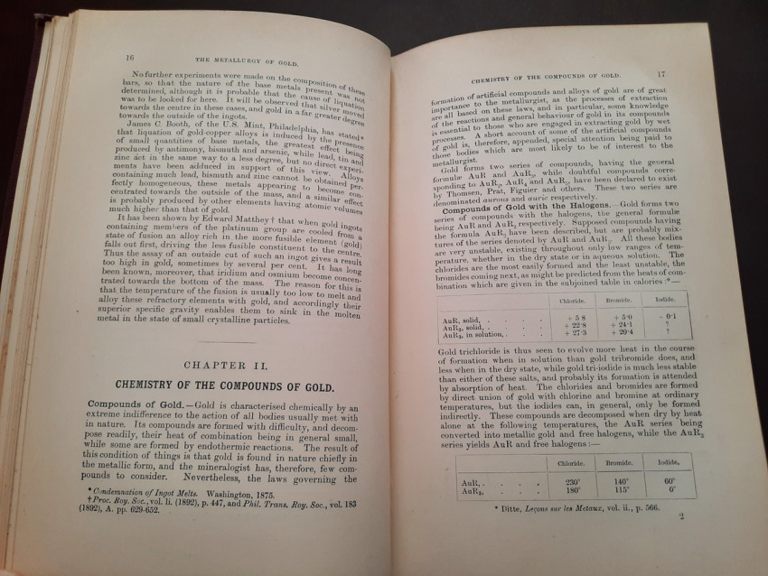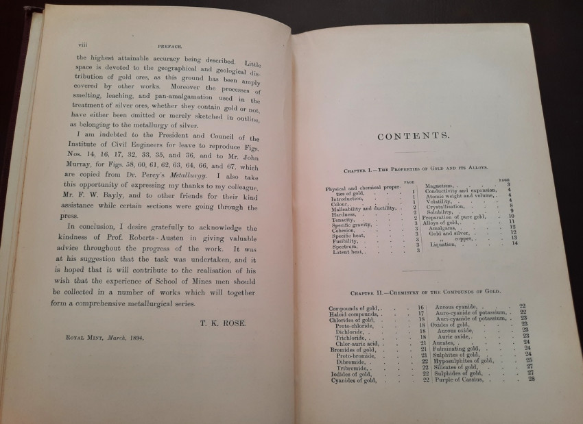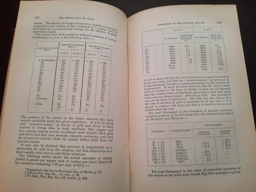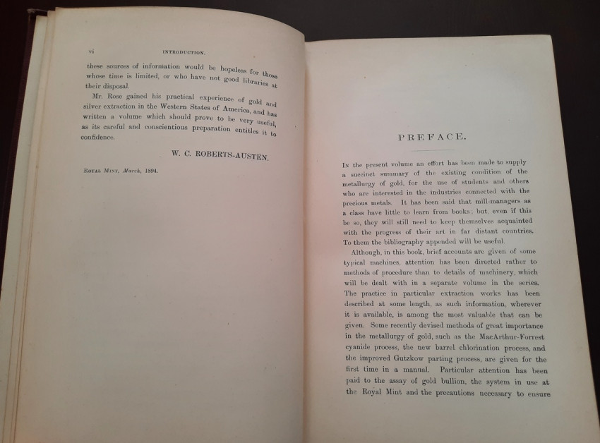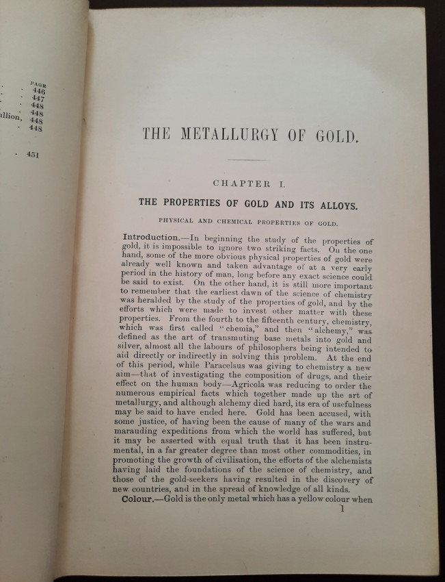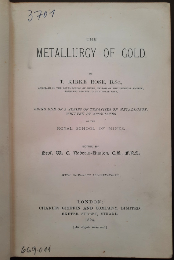 A first edition of this fascinating work. Rose's treatise on the metallurgy of gold, part of a series on metallurgy issued by the Royal School of Mines. Supplying the reader with a succinct summary of the existing condition of the metallurgy of gold at the tail end of the Victorian era. Looking at the proprieties of gold and its alloys, chemistry of the compounds of gold, deep placer deposits, quartz crushing in the stamp battery, chlorination, the refining of gold bullion, and more. Illustrated with 69 in-text illustrations throughout and many diagrams, tables, formulas, extensive bibliography, and index. Including "Stamp battery practice in the Transvaal" (the account mainly based on information supplied by Mr. S.H.Farra M.I.C.E., F.G.S., M.I.M.E., of Johannesburg - Apendix B.).
