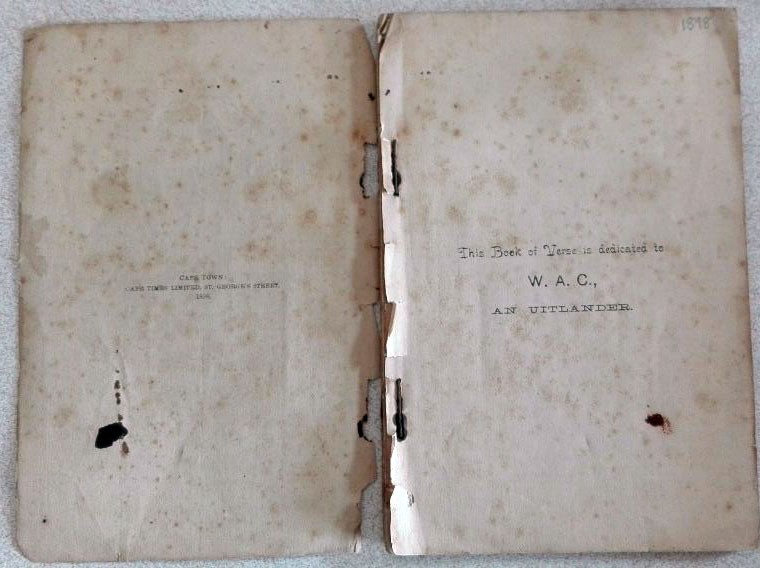 Original pictorial wrappers, quite weak at the hinges and front cover has come loose. 50p. Covers are slightly foxed. A collection of poems on South Africa, touching on the Jameson Raid and issues concerned with Transvaal politics. "The book of verse is dedicated to W.A.C. an Uitlander" is on the title page. Other titles include Ginger James, A Tommy's Welcome to Rudyard Kipling amongst others. Small illustrations with each poem.
