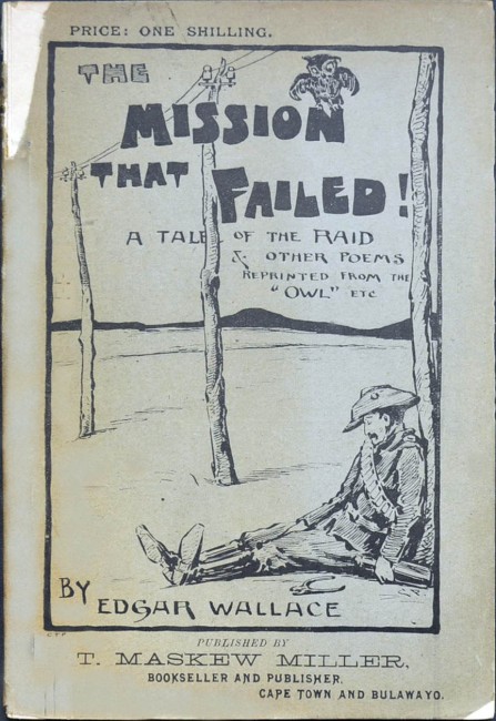 This fragile booklet is Edgar Wallace's first publcation. It is a 52pp. volume of poetry, subtitled : A Tale of The Raid and Other Poems Reprinted from the "Owl" etc. The Jameson Raid and other South African topics. The wrappers of this book are almost always chipped. This copy has an 8x30mm. chip and the top of the front panel adjacent to the spine and a few smaller chips. Internally it is clean and unmarked.