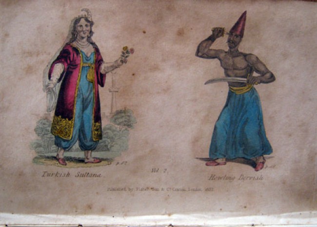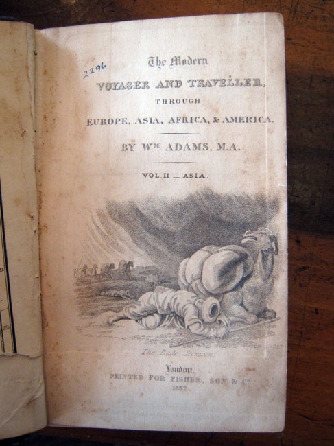 Vol 2 describing travels in Asia. Half leather, marbled boards, gilt lettering on spine. Edges are worn and paper on boards has been rubbed away in places. 460p, fold-out map facing title page (torn along fold, but intact), 9 hand coloured plates. Some foxing. Numbers in ink on title page. Covers the regions of the Balkans, Black Sea and Turkey, Jerusalem and Syria, Persia, Nepal and Tibet, China and Java.
