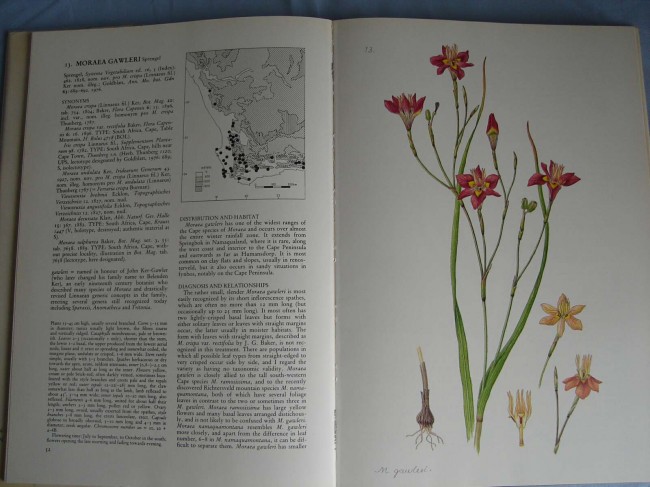 Map of the geographical distribution of Moraea in Africa. Distribution maps per species. More than 60 full page colour paintings. Pages i-xi; pp1-224.
