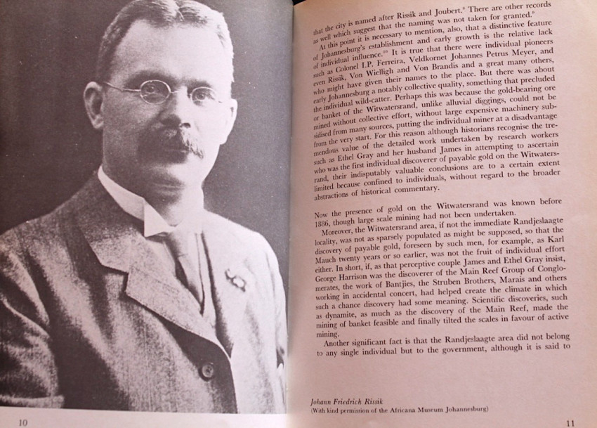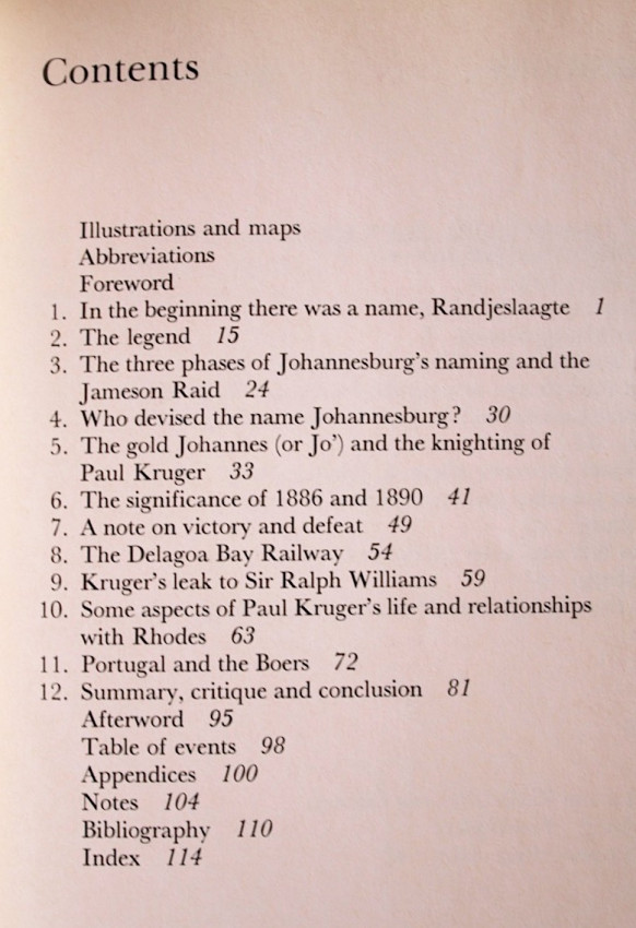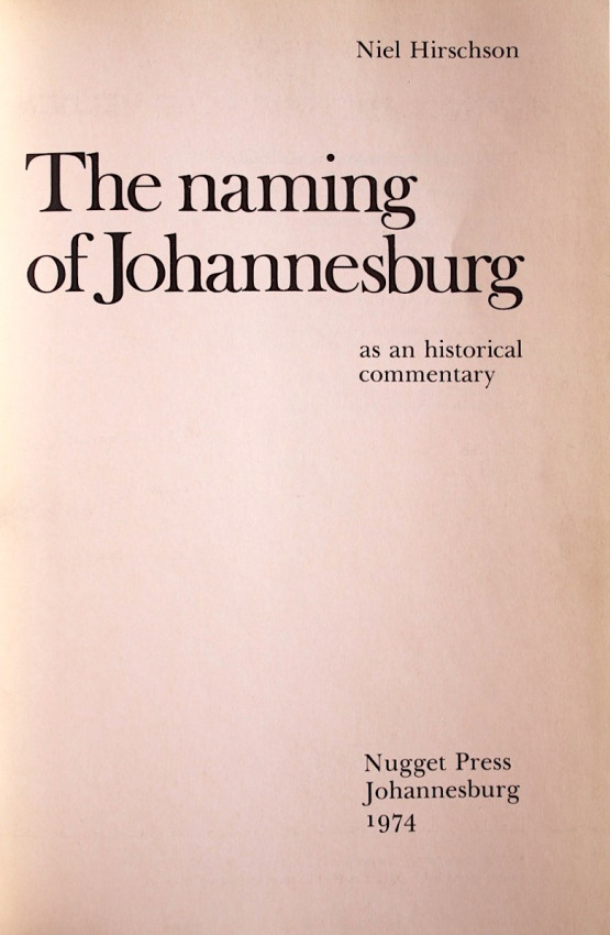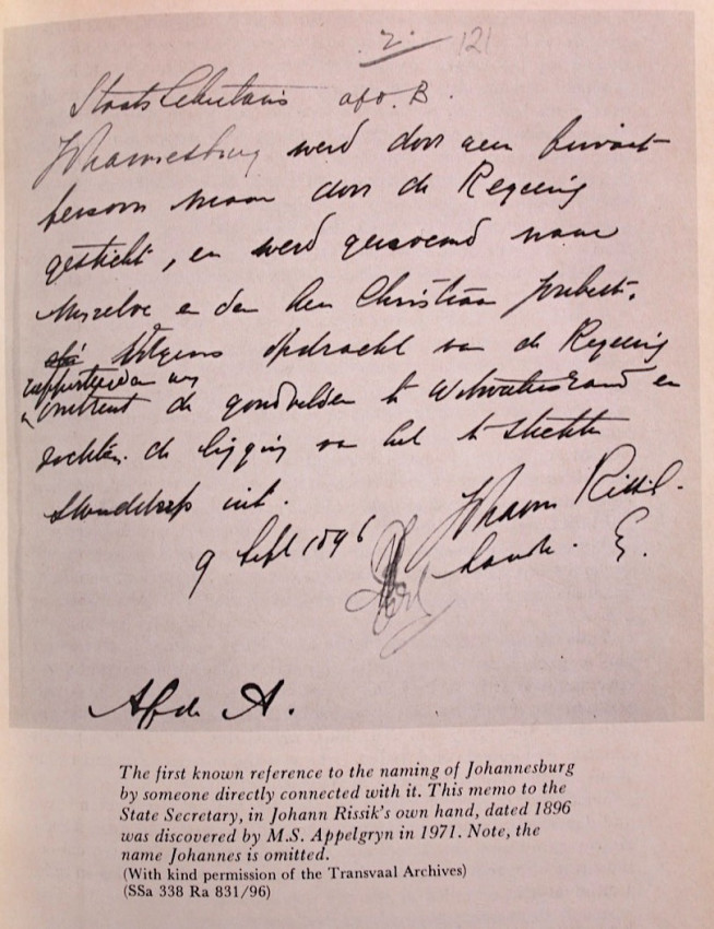 In a fascinating study, the author presents an original and convincing thesis. The name, given by President Paul Kruger in 1886, was only later, in 1891, ascribed to the combined names of Johann Rissik and Christiaan Johannes Joubert. Its basis in 1886 had nothing to do with either of these personalities.