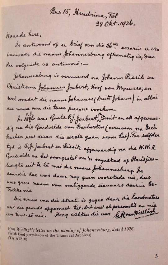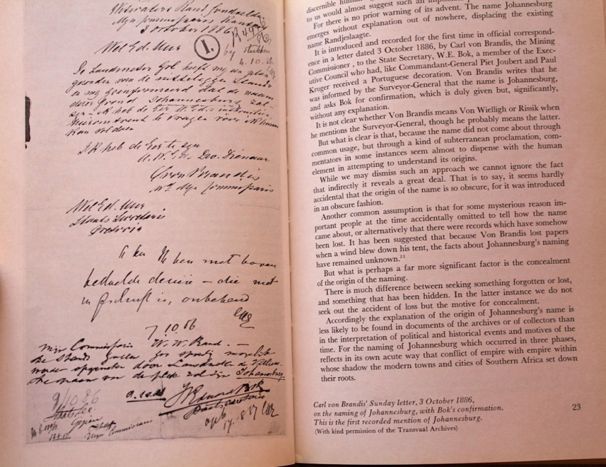 'The first recorded hint of the name Johannesburg occurs in a Sunday letter written by Capt. Carl von Brandis, and dated 3 October 1886.