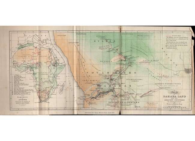 xiv + 314 pages, tinted lithographic frontispiece, coloured folding map of Damaraland with an inset of Africa, 3 tinted lithographic plates, 1 full page engraved plate of Nangoro King of the Ovampo, 4 engraved illustrations in the text, original speckled brown cloth titled gilt on the back and with a gilt vignette on the upper cover. The folding map is frayed at the fore-edge with very slight loss of the printed area, tape stains on the frontispiece and title page, new endpapers. The cloth is fraying along the lower joint but overall is in unusually good condition, the contents and lithographic plates are bright.