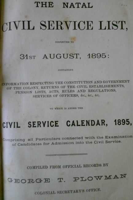 The 1895 issue of the Natal Civil Service List was the first of the series, superseding the civil establishment returns in the colony's blue books.