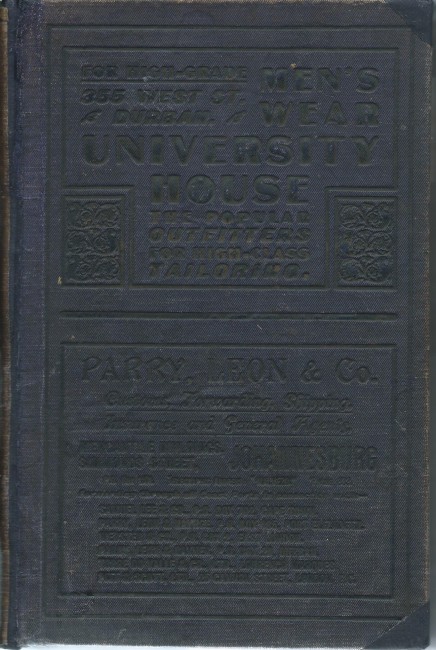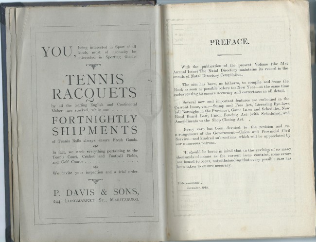 1 volume (various paginations). Advertisements, Pietermaritzburg street directory, alphabetical list of Pietermaritzburg residents, alphabetical list of residents of Natal towns and villages, brand register for sheep, cattle and horse farmers, alphabetical list of Durban residents, Durban street directory, list of office bearers of Natal sporting associations, Church almanac, list of Natal Justices of the Peace and Statutes, Civil Servant listings and chapter dealing with "Leading Events in Natal History".