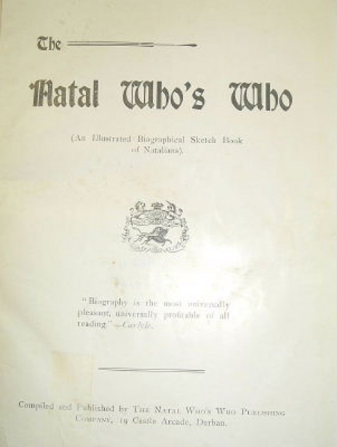 The first biographical register of Natal people, including soldiers, businessmen, administrators, educators and socialites. Interesting that no women were included. Pp. 223, portraits of many of those featured. Rebound modern cloth, lacking the half-title, some worming inner back hinge, some pages repaired, pen note on front end-paper & some underlining in the text. A good working copy of a rare book