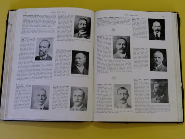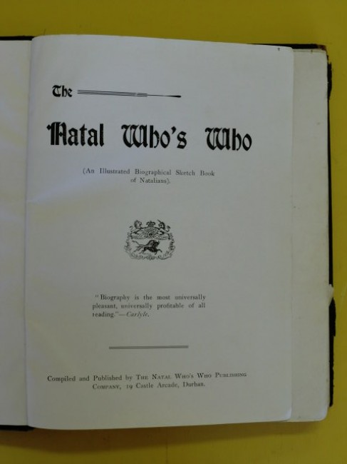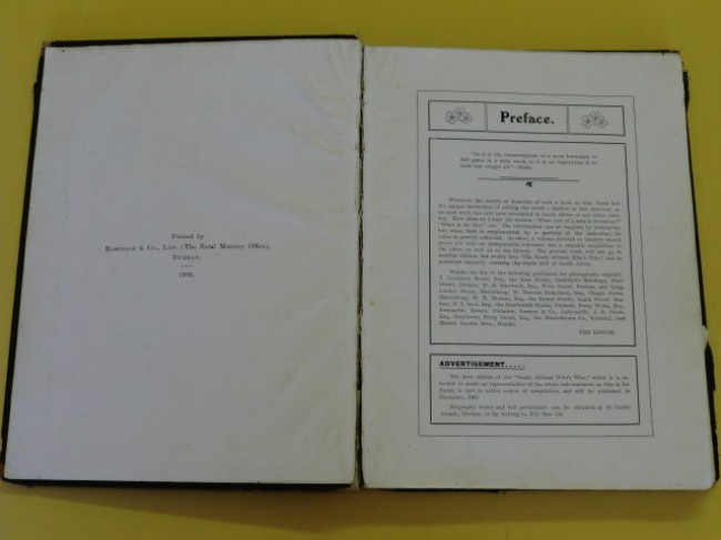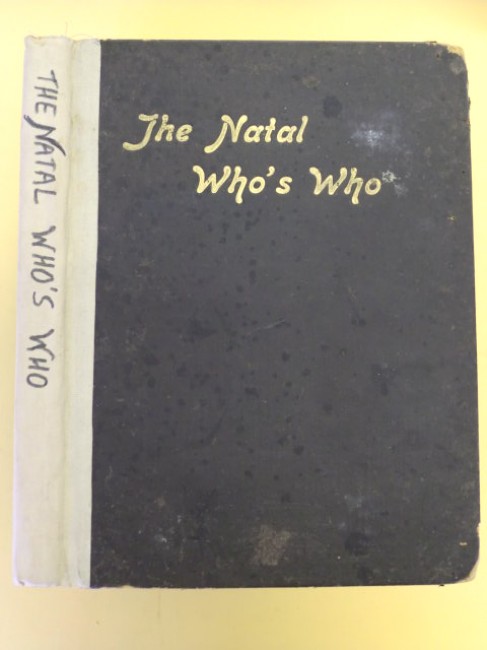 \"An Illustrated Biographical Sketchbook of Natalians\" - A good copy of a scarce, very early edition of the biographical dictionary, giving unique insight into the most prominent early pioneers, businesspeople, mining agents, merchants, bankers, accountants, academics, entrepreneurs, engineers, military men, missionaries, etc... of particular interest are Ernest Leslie Acutt, T.F.Baynes (who witnessed the first 15lb. shot fired by Jameson\'s Raiders against the Boers), Alfred Cyril Braby (publisher), William Watts Cato (land surveyor, Durban), Peter Davis (Proprietor of the Natal Advertiser and Natal Witness), Edwin Greenacre (merchant), A.D.Nourse (cricketer), Shepstone (A.J., H.C., J.W.,P.W. and T.), F.S.Tatham (Pietermaritzburg), John Medley Wood (Director Botanic Gardens), 223pp; this copy\'s contents are in good condition, but the cover is in a worn state; p.219/220\'s fore-edge is heavily creased and chipped due to having been loose (now stuck back in); some marking and small tears to some of the pages; the boards are worn with heavy wear to corners, and the spine has been replaced with white cloth tape and the title written along it by hand, original gilt title on front board, inner binding good except for the first gathering up to about p.14 which is shaken and loose, the joint between title page and preface the most severely affected (cracked); olive green end-papers surprisingly good, with slight evidence of some previous worm activity on all four corners of the boards. Extremely scarce.