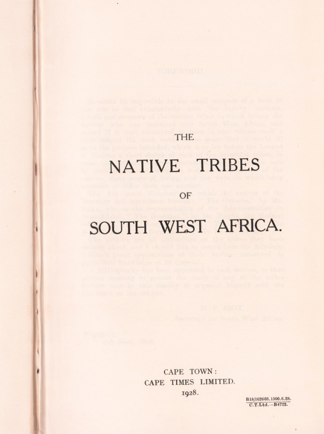 Contains: THE OVAMBO by C.H.L. Hahn, Officer in charge of Native Affairs Ovamboland. THE BERG DAMARA by H. Vedder, Praeses of the Rhenish Mission in Damaraland, THE BUSHMEN OF SOUTH WEST AFRICA, by L. Fourie, M.B.E., M.B., F.Z.S., medical officer to the administration, THE NAMA, by H. Vedder, and THE HERERO, by H. Vedder..