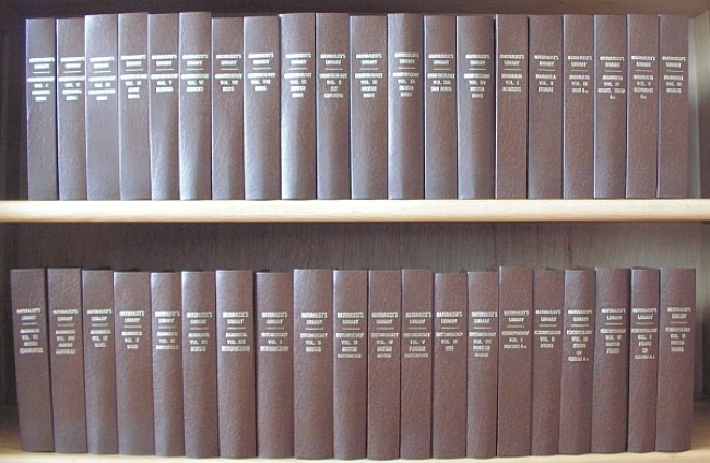 Complete set of this celebrated work; forty crown 8vo volumes in all, in serviceable modern brown leatherette bindings, with gilt lettering to the spines. Fully collated, with all plates present: the few apparent discrepancies are clarified by the publisher's addenda and errata slips in the volumes. The standard of the colouring is consistently excellent throughout the thirteen hundred-odd plates. The arrangement of this set, based on the spine lettering and numbering, is taxonomic rather than chronological, with sections devoted to Ornithology, Mammalia, Ichthyology and Entomology. Some tissue-guards have worked loose; sporadic light-to-moderate foxing throughout, which is rather more pronounced in volume 3 of the Ornithological section (Gallinaceous birds); trace of fishmothing to edges of a couple of plates in volume 2 of Ornithology (Humming Birds, Part II), not affecting the images, and a gathering pulled in the same volume; Plate 10 in volume 11 of Ornithology (Birds of Great Britain and Ireland, Part II) rather scuffed. Numerous woodcuts in the text illustrate the work, besides the excellent plates after works by scrupulous natural history artists of the period, many of them renowned, such as Edward Lear. The title page vignettes and frontis. portraits are generally reckoned among the plates in the Contents pages. Lizars was one of the most competent producers of natural history engravings during the period, having been responsible for the early work on Audubon's 'Birds of America'. This is a remarkable set, the volumes largely in very good condition, and the plates outstanding.