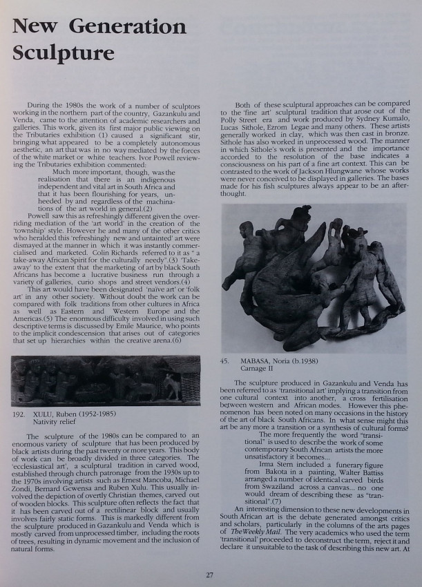 A catalogue of an exhibition held at the Johannesburg Art Gallery from November 1988 to January 1989. Steven Sack was guest curator of this exhibition. With a textual introduction to the exhibition, full details of the paintings and sculptures exhibited, and biographies of the artists included.