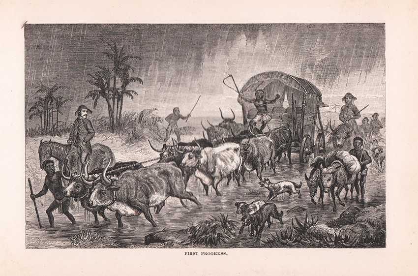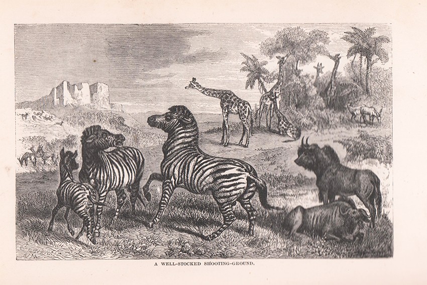 First American Edition. 364 pages, wood engraved frontispiece, engraved title page vignette - a portrait of the author, added title page, folding coloured map, 15 plates, original green cloth binding with gilt vignette of a rhino on the upper cover and a gilt vignette of a hippo on the back cover, titled gilt on the spine, the covers are scuffed and worn, the contents are bright, a good copy.
