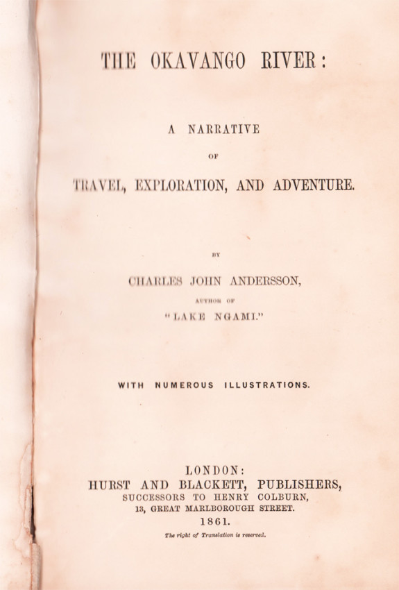 Wallis (J.P.R.)'Fortune My Foe (1936), pages 256-258. 'From a variety of causes it was less effective than his Lake Ngami. In the first place, his instinctive reticence shrank from obtruding his personal sufferings and disappointments upon his reader. It was a manly modesty in him, but did his narrative less than justice. So it is that while the first chapters are as attractive as anything in Lake Ngami, and perhaps fine in their record of achievement and maturer in spirit, the later portions too readily decline into transcripts from the journals and show a falling off in freshness and gusto.' Andersson had been unable to follow the book through the press and was disappointed in the lack of editorial control in the final product. An American edition was issued in the same year but it was not reprinted in London and remains perhaps the scarcest of Andersson’s books.