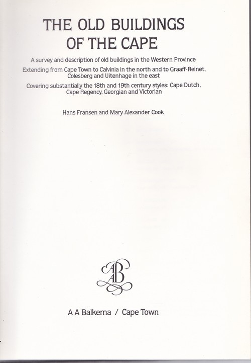 A survey and description of old buildings in the Western Province, extending from Cape Town to Calvinia in the north and to Graaff-Reinet, Colesberg and Uitenhage in the east. The styles covered include Cape Dutch, Cape Regency, Georgian and Victorian. This edition includes new gable diagrams, ground plans and half-tone illustrations.