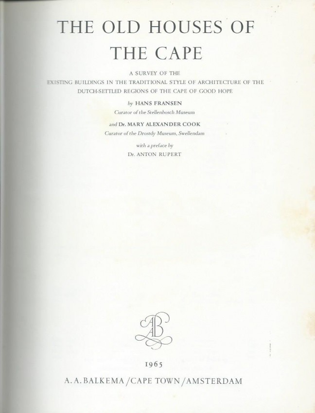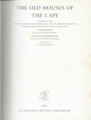 An important, thoroughly researched & scholarly survey of the houses of the Cape. Well illustrated, with plans of towns and individual houses. Covers the area from Cape Town to Clanwilliam in the west and to Graaff-Reinet in the east.