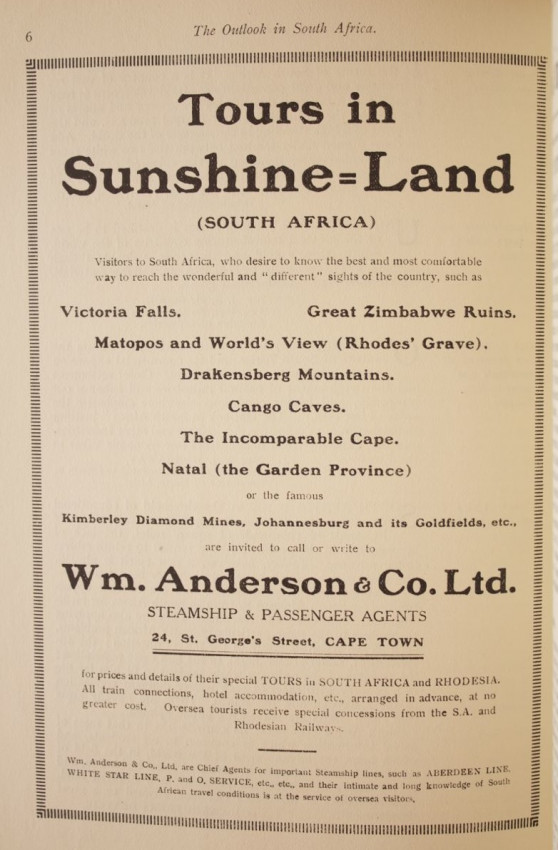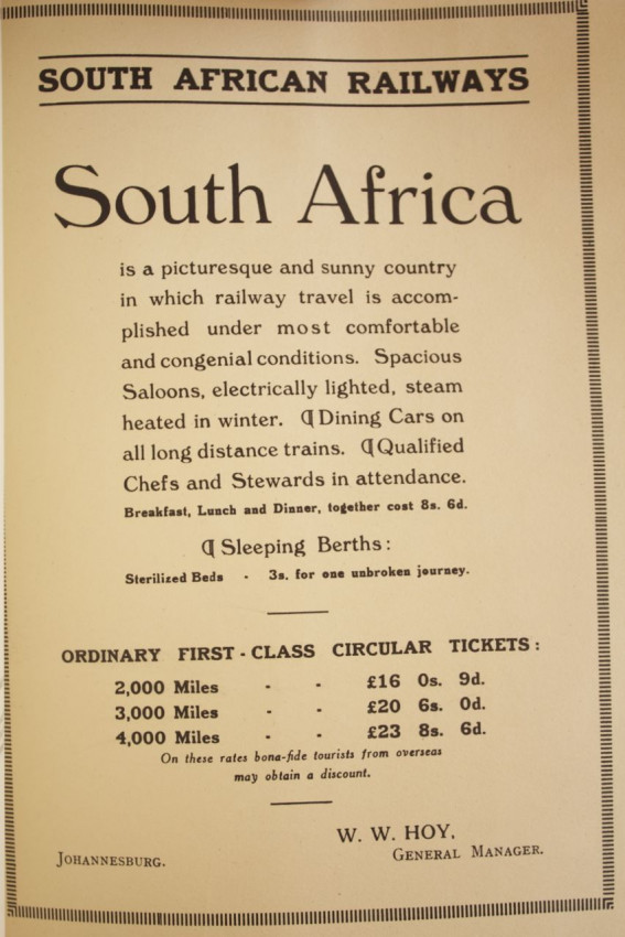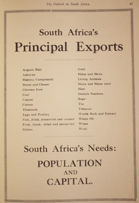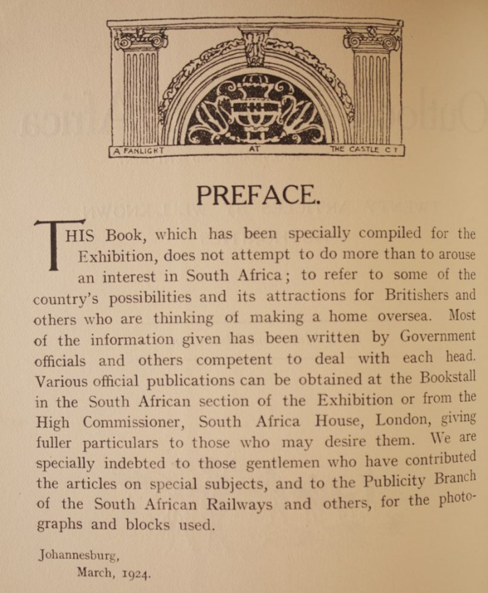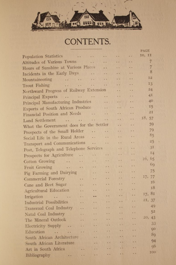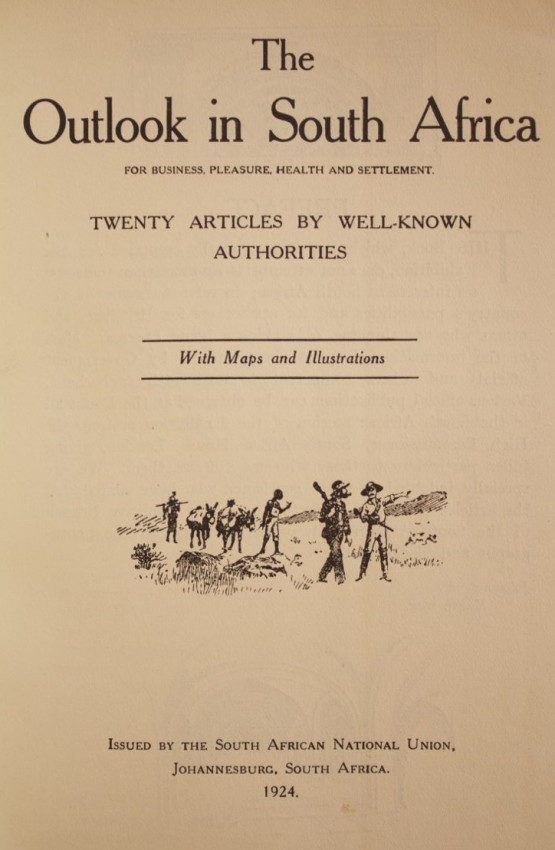 A promotional booklet "For Business, Pleasure, Health, or Settlement" containing twenty signed articles by well known authorities on the resources of the Union of South Africa, with illustrations and contemporary adverts in profusion.
