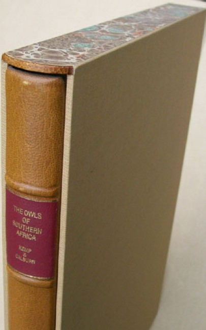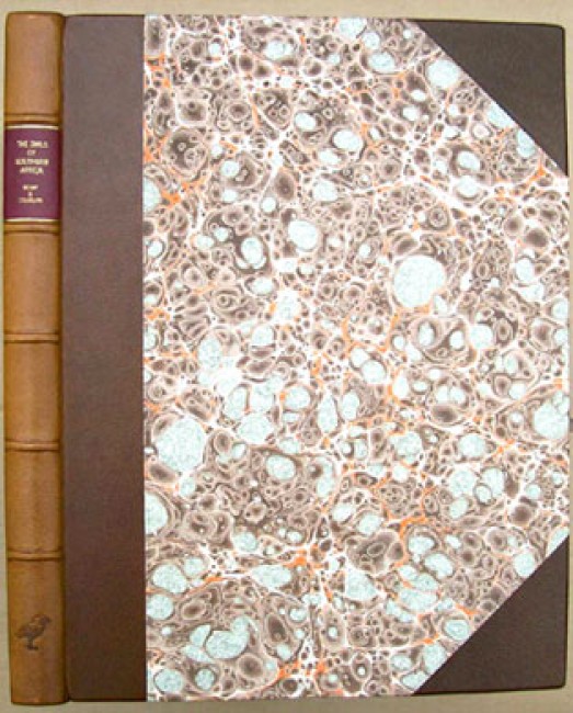 Housed in the original light brown book cloth covered slipcase with hand marbled paper and leather trim matching the brown leather binding which has a red title label on the spine and marbled paper covered boards.