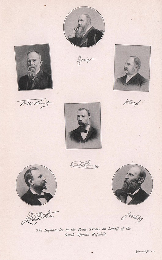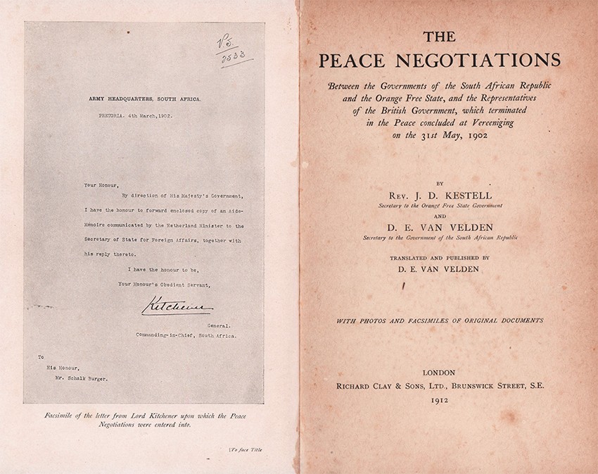 Mendelssohn (Sidney) South African Bibliography volume 1 page 815: The Peace Negotiations between the Governments of the two South African Republics and the Representatives of the British Government, which resulted in the Peace agreed on at Vereeniging on May 31, 1902. The contents include the preliminary correspondence, transactions at Klerksdorp and Pretoria, with a full account of the Debates. There is also a Preface written by S. W. Burger, Acting President, and several plates and facsimiles of important documents.