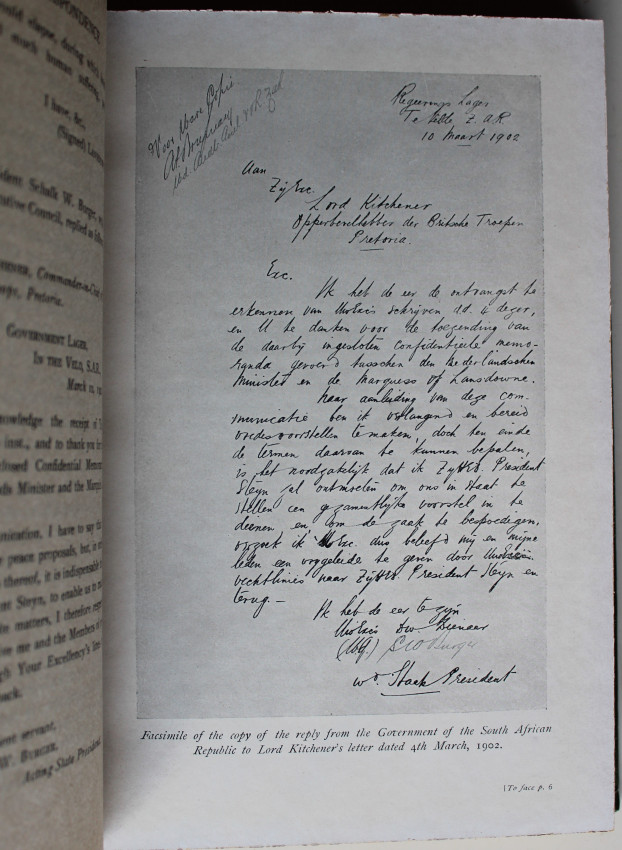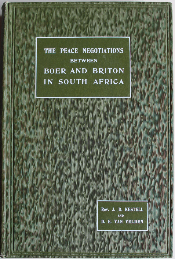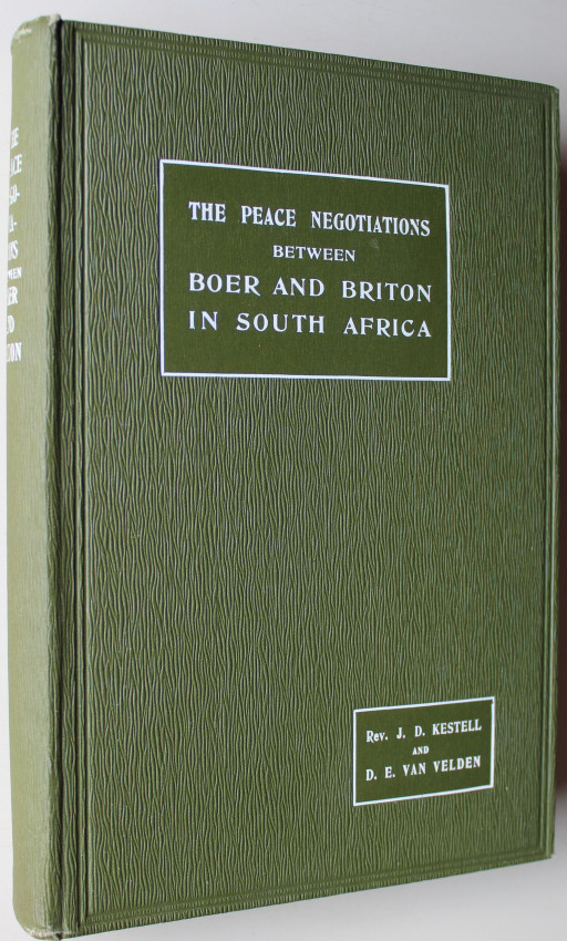 The Peace Negotiations between the Governments of the two South African Republics and the Representatives of the British Government, which resulted in the Peace agreed on at Vereeniging on May 31, 1902. The contents include the preliminary correspondence, transactions at Klerksdorp and Pretoria, with a full account of the Debates. There is also a Preface written by S. W. Burger, Acting President, and several plates and facsimiles of important documents. (Mendelssohn page 815)