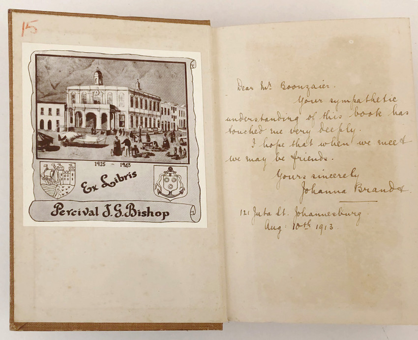 Johanna Brandt (1876 - 1964) was a South African propagandist of Afrikaner nationalism, spy during the Boer War, prophet and writer on controversial health subjects. After the war she wrote her own account of the Irene Concentration Camp, but her most well-known book was The Petticoat Commando, which told of her and her mother's exploits during the Boer War. The book is dedicated to her mother, "As a peace offering for having brought her into publicity in direct opposition to her wishes”. Together with Winston Churchill, Sol Plaatje and Arthur Conan Doyle, Brandt appears on a series of stamps issued by the South African Post Office in the year 2000, featuring writers of the Boer War. A lovely copy with a nice inscription and an interesting provenance.