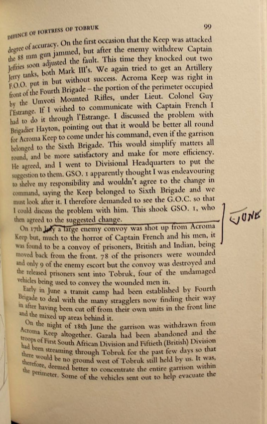 Inscribed by the author and dated on the front endpaper. Additionally the author has corrected dates by hand on pages 96 & 99. There is a typed letter at rear regarding information about Tobruk as well as Officer Bestford.