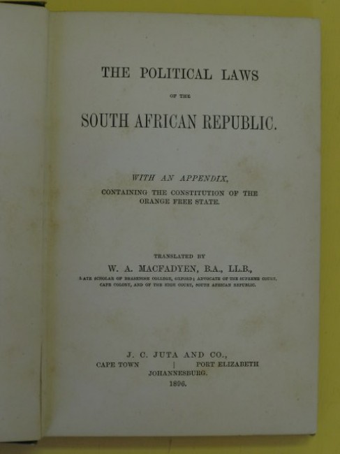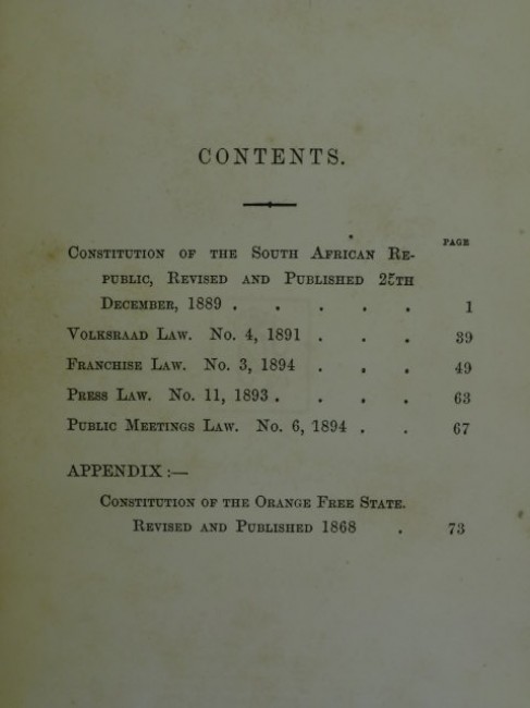 In five sections, namely 1) Constitution of the South African Republic, revised and published 25th Dec,1889 2) Volksraad Law No.4, 1891 3) Franchise Law No.3, 1894 4) Press Law No.11, 1893 5) Public Meetings Law No.6, 1894. APPENDIX: Constitution of the Orange Free State, Revised and Published 1868, total 86pp. inclusive. Book condition: original green cloth, title in gilt on front board, paper yellowed with age, binding and end-papers good, though some gatherings (between pp.64/65, 48/49, 32/33) are cracked; text is good, with a few pencil notes in the margins and some underlining, three owner inscriptions on f.f.e-p and verso, corners bumped and worn, spine worn. Scarce first edition.
