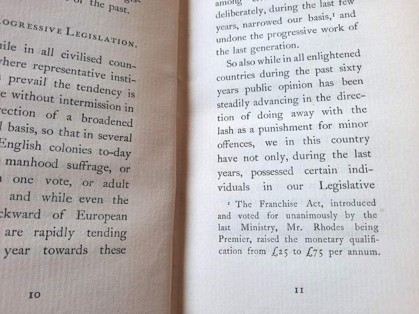 "So again, with regard to land tenure; while in all progressive countries there is a tendency to obtain and retain as large a part as possible of lands, mines, and great public works as the property of, and to be worked for the benefit of, the nation as a whole—we, in this country, are for ever and completely alienating our public lands, our minerals, our precious stones, and even our public works. And further, not only are we alienating them within our own boundaries, and allowing almost without a struggle a small band of Monopolists to gain possession and control of that wealth which should be ours and our children's to employ for the benefit of the nation that shall be, but we are enabling them to grasp adjacent territories still uninhabited by the white man, so that when the mass of civilised men shall enter into occupation there, they will find nothing of value left for themselves in that state which, by their labour, they will have to build up; the alien will already have set his grasp upon all that is fair or rich. For not as in other countries has the Monopolist risen up among us, a growth of our own; he comes from a foreign clime, and sweeps bare the virgin land before him like the locust; and, like the locust, leaves nothing for his successors but the barren earth." (Quoted from pages 14-16)