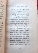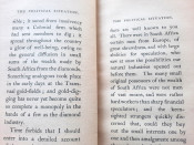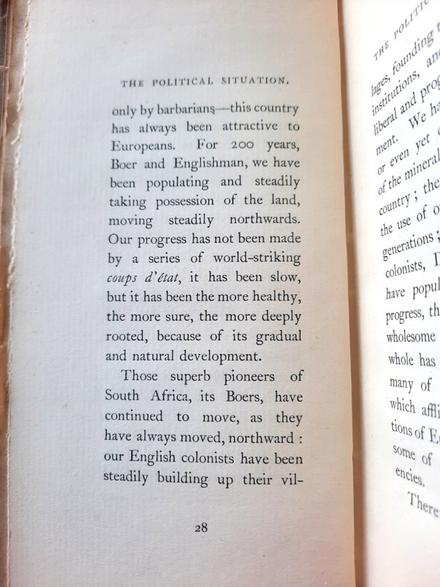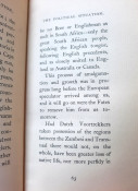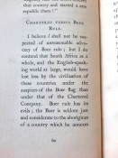 “Granting what has been stated as being exactly true; allowing that the Monopolist has filched away the wealth of South Africa; and granting that his party, by coalescing with the extreme Retrogressive Party, has given it for the time being an unhealthy preponderance; granting, further, that to retain control over the Colonial Legislature squaring in all its multiple forms has been, and is, a necessity on the part of the Monopolist Party; granting that this is disastrous to our public and social life - yet is it not worth our while to connive at all these conditions, and to abstain from disturbing them, as long as the Monopolist Party is quietly and persistently moving in a direction which tends to annihilate the independence of two adjoining States, which shall ultimately render the Englishman dominant throughout South Africa? At the cost of whatever evils or injustice, is it not well to see extending northward the territory more or less under British rule?” (Quoted from pages 45-46)