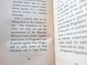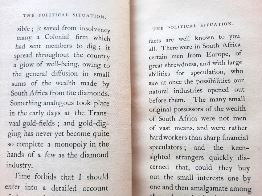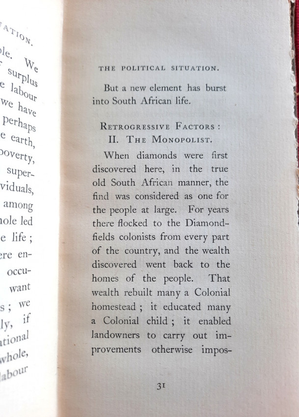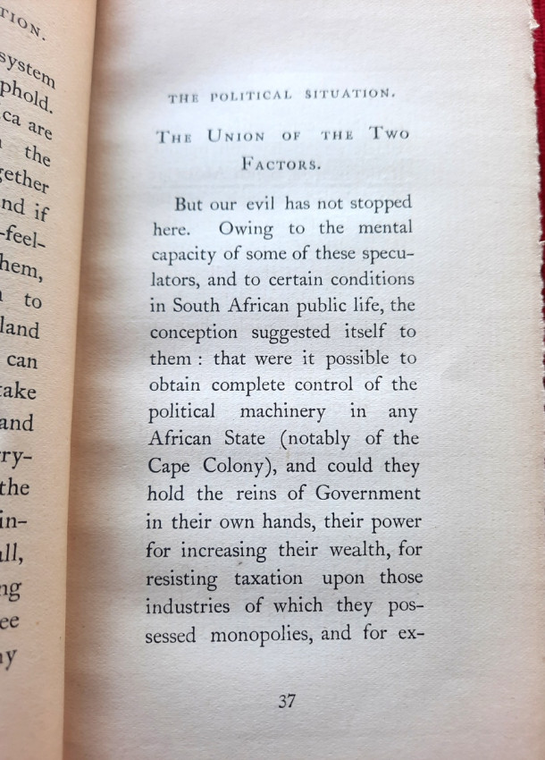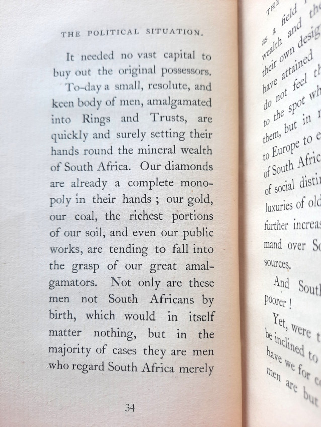 "To-day a small, resolute, and keen body of men, amalgamated into Rings and Trusts, are quickly and surely setting their hands round the mineral wealth of South Africa. Our diamonds are already a complete monopoly in their hands; our gold, our coal, the richest portions of our soil, and even our public works, are tending to fall into the grasp of our great amalgamators. Not only are these men not South Africans by birth, which would in itself matter nothing, but in the majority of cases they are men who regard South Africa merely as a field for the making of wealth and the furthering of their own designs. When they have attained their end they do not feel themselves bound to the spot which has enriched them, but in most cases retire to Europe to expend the wealth of South Africa in the purchase of social distinction and in the luxuries of old-world life, or in further increasing their command over South African resources. And South Africa grows poorer!" (Quoted from pages 34-35)