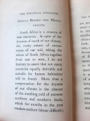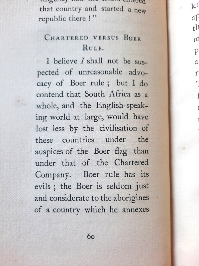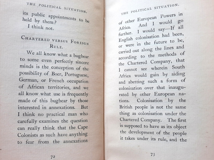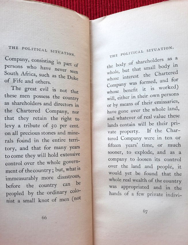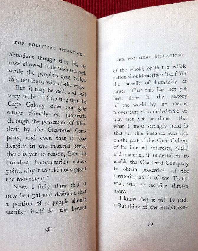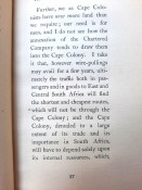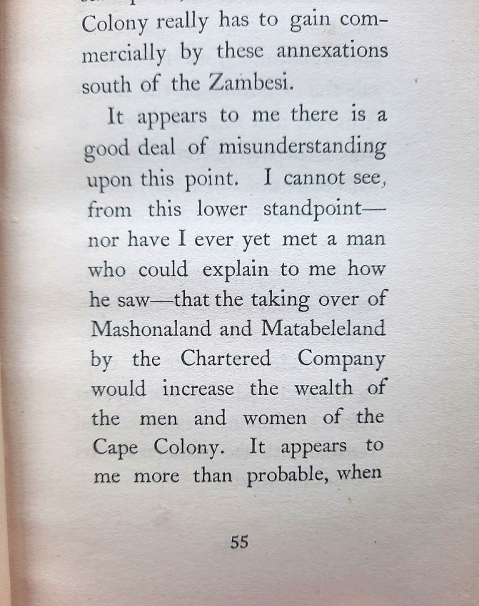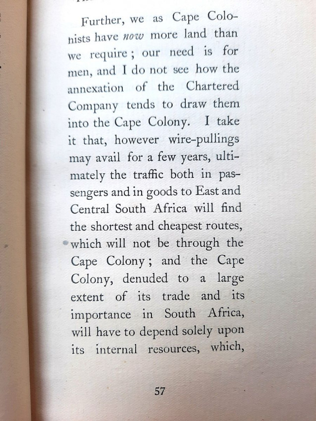 “Further, we as Cape Colonists have now more land than we require; our need is for men, and I do not see how the annexation of the Chartered Company tends to draw them into the Cape Colony. I take it that, however wire-pullings may avail for a few years, ultimately the traffic both in passengers and in goods to East and Central South Africa will find the shortest and cheapest routes, which will not be through the Cape Colony; and the Cape Colony, denuded to a large extent of its trade and its importance in South Africa, will have to depend solely upon its internal resources, which, abundant though they be, are now allowed to lie undeveloped, while the people's eyes follow this northern will-o'-the wisp. But it may be said, and said very truly: “Granting that the Cape Colony does not gain either directly or indirectly through the possession of Rhodesia by the Chartered Company, and even that it loses heavily in the material sense, there is yet no reason, from the broadest humanitarian standpoint, why it should not support the movement.”” (Quoted from pages 57-58)