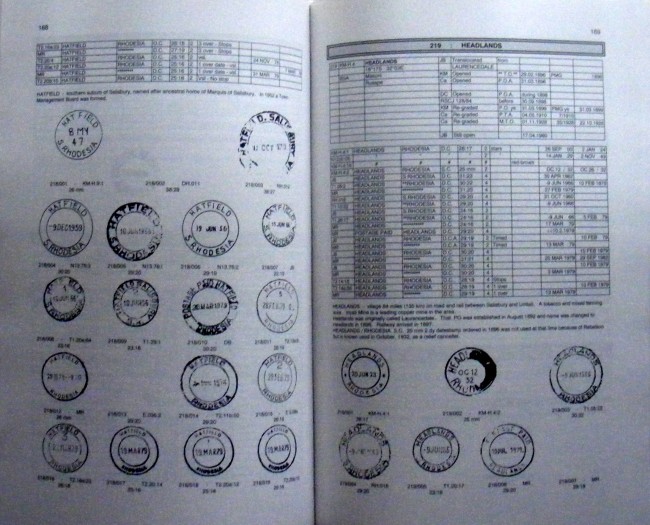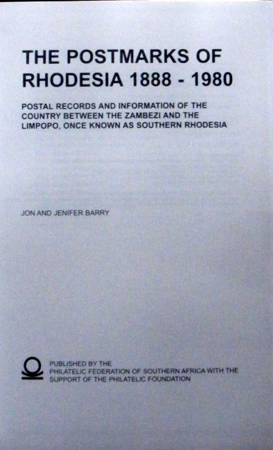 The Postmarks of Rhodesia 1888-1980, postal records and Information of the country between the Zambezi and the Limpopo, once known as Southern Rhodesia, Philatelic Federation of Southern Africa with the support of the Philatelic Foundation, hardcover, 210 x 310mm, 447 pages, list of subscribers,some slight edgeware on rear lower edge of dustjacket, condition:very good.