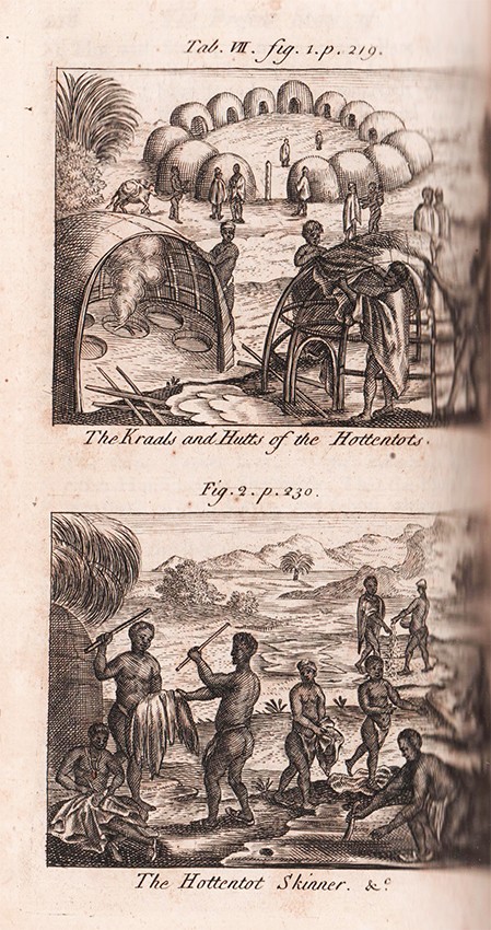 The plates are based on those in the 1719 German edition. Volume 1 contains the plates depicting Hottentots customs, Vol 11 the natural history illustrations. The 3 plates in volume 1 Buchu, Dacha and Kanna do not appear in the German edition. There are 2 unumbered plated in volume 1. Volume 2 has 10 plates.
